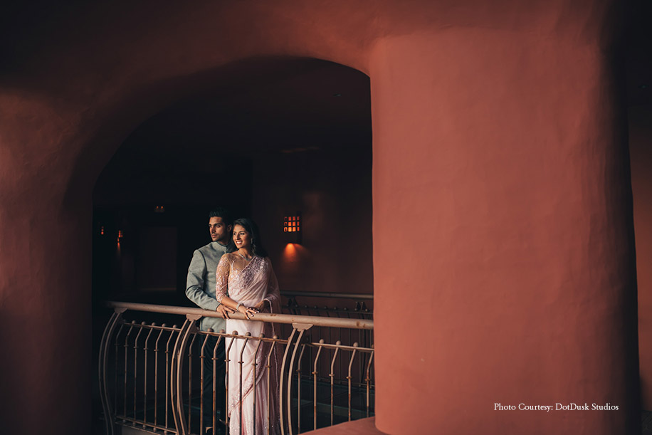 All the guests were gifted goodie bags when they arrived in their rooms which were designed and picked by family members. The Welcome Lunch was followed by an intimate engagement ceremony called ‘Misri’ which is typically a ring ceremony and the first ritual in a Sindhi wedding. Romina looked beautiful in a powder pink saree, while Jiten looked dapper in a grey and black ensemble.