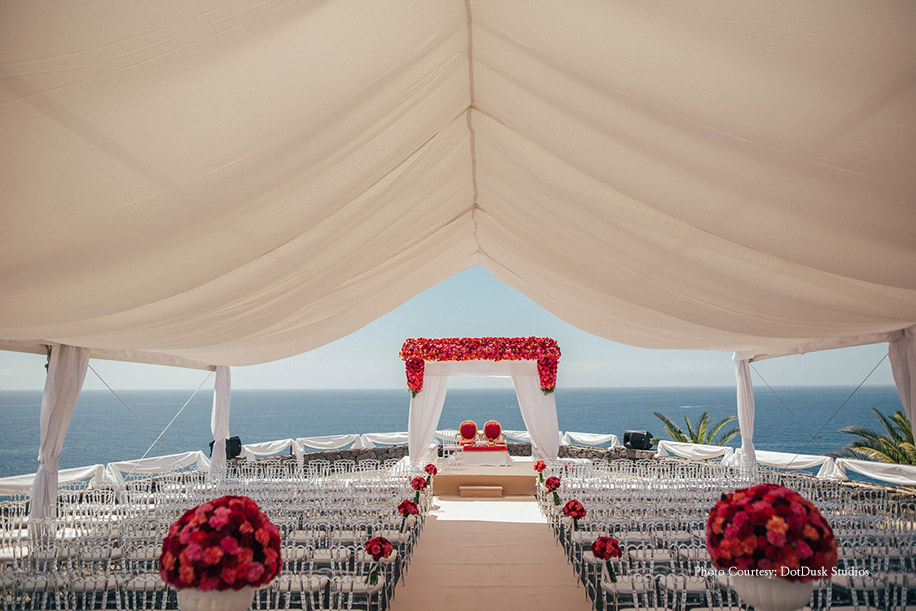 This day started with the Sindhi ‘Vanva Puja’ which is a separate ceremony for the bride and groom and is akin to a cleansing process before the marriage. The mandap with billowing white drapes was constructed by the oceanside and was decorated with bright floral arrangements. It was one of the key scenic highlights of the event. Romina walked down a flower-strewn path into the next chapter of her life surrounded by her loved ones. The ceremony itself was a beautiful blend of wedding customs and was followed by a cocktail and reception which included a sit-down dinner. Every one of the 35 tables had values assigned to it which Jiten and Romina believe in such as trust, commitment, and respect. The bride and groom gave a special performance of a type of dance form called the Flamenco dance. The bride has been doing it for years, and she wanted to do with her husband as a surprise for the guests. Guests were also entertained by the Vyas Brothers who performed at the event.
