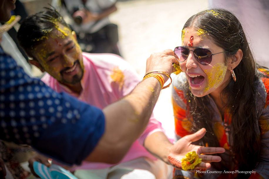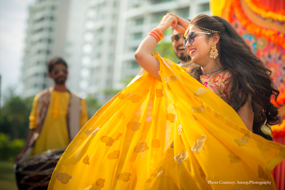 “With Punjabi style kitschy décor spread across the green lawn, lots of dancing and the dhol – we started off with a bang! We decided to coordinate our clothing with the themes so we wore yellow to this event. My lehenga was designed by Ms. Swati Rohila – a Jaipur based designer. Saket wore an ethnic kurta kothi designed by Sasha, Kolkata.”