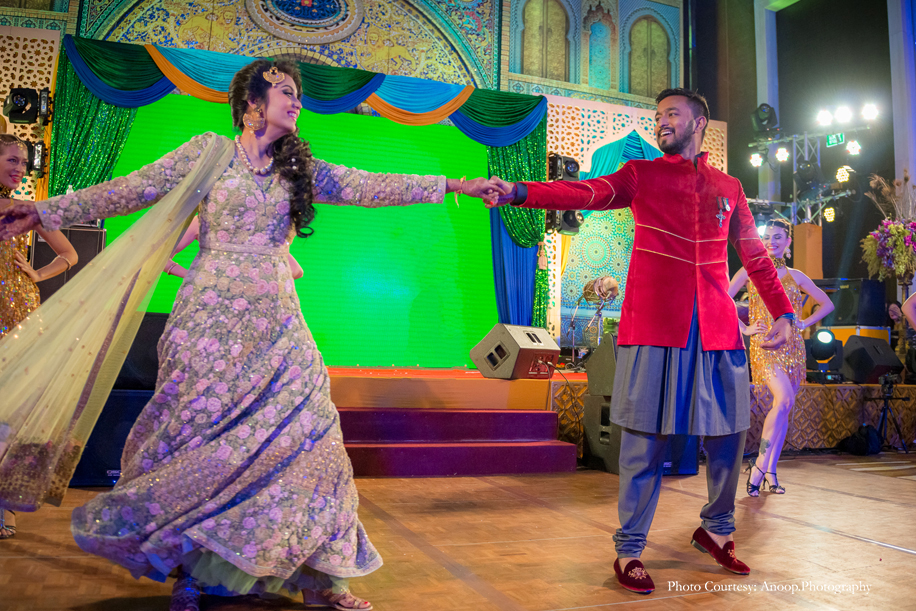 “After all the fun, it was time for some rituals. The Sangeet started with a beautiful dance performance inspired by Morocco. Our outfits were well suited to the theme. I wore a gown designed by Sabyasachi Mukherjee and the groom wore an achkan designed by Shantanu & Nikhil.”
