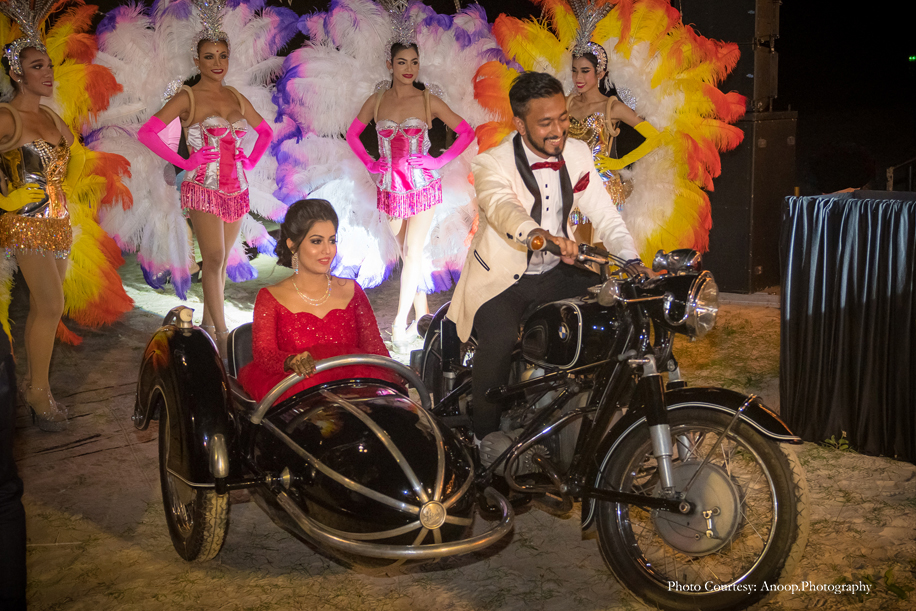 “We wanted the ring ceremony to be a western style event so we chose The Great Gatsby theme with black and gold décor and a dress code to complement it. I wore a red gown designed by Ms. Swati Rohila. Saket wore a tuxedo designed by Mr. Ravi Dholakia.”