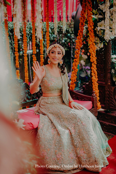 Held under a canopy crafted out of pale and bright-pink hues, this bride’s mehndi included an ornate swing adorned with dainty blooms.