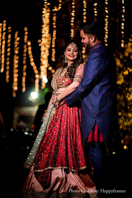 Hailing from hardcore, Garba loving families, the couple decided to swap the Sangeet for a traditional Garba Raas where everyone could hit the floor and dance to their heart’s content. Parthiv Goyal’s lovely tunes made it a memorable night. The bride’s traditional twirling lehenga by Qbik perfectly complemented Jayesh’s blue and red outfit.