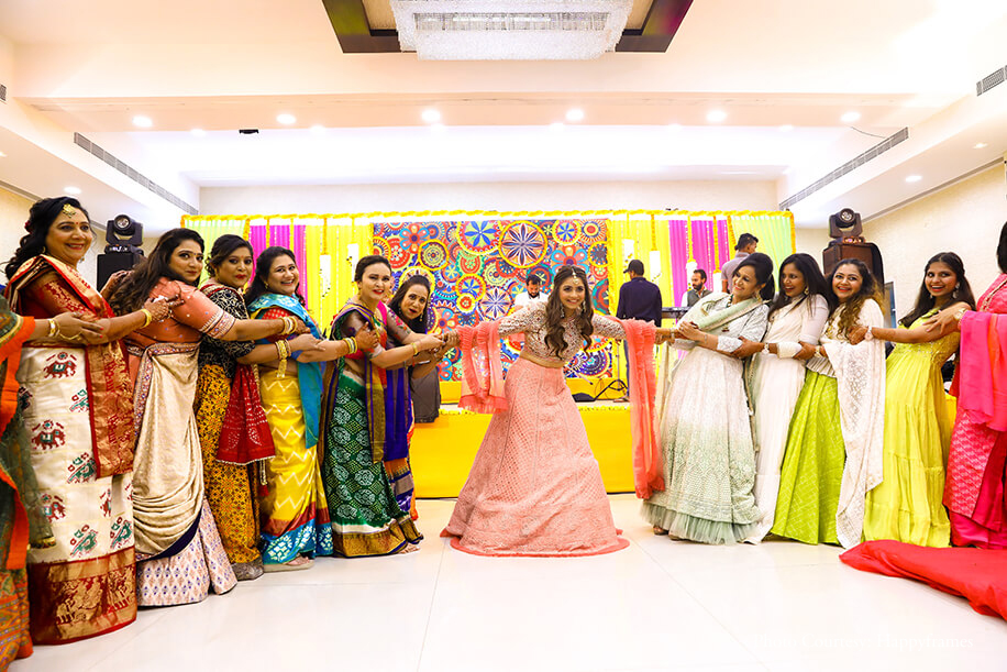 The bride shares, “With colorful décor of elements like pomps, phumtas, tokris and drapes, my function was a mix of traditional and funky. The dress code was fully coordinated for my family, with my dad’s side wearing patola outfits, and my mom’s side wearing Lucknowi Chikan work outfits. I wore a mix of the two with a charming pink chikan-work lehenga with a patola print top that matched my dad’s outfit. In a surprise twist, Jayesh made a dashing entry dancing on ‘Tenu Leke Mein Jawanga’.”