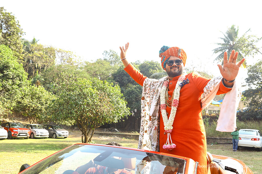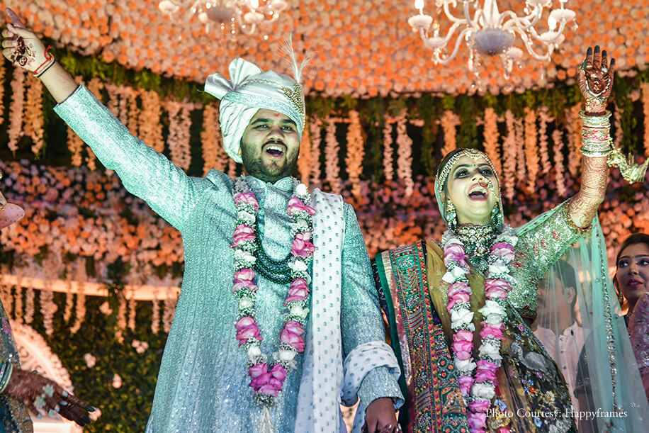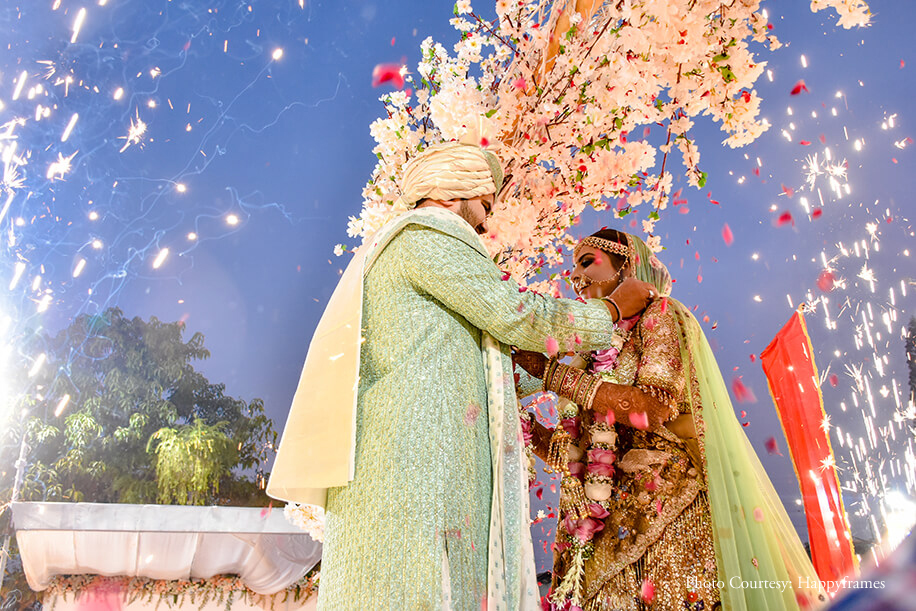 The eventful wedding started with a raging baraat that went on for 2 hours as everyone grooved to the tunes of DJ Prasad’s Maharashtrian and Punjabi Dhol. The bride’s family welcomed the baraatis with a surprise flashmob performance of their own. The groom entered in royal splendor flanked by his family and flag bearers, while the bride entered holding her parent’s hands under a spectacular phoolon ki chadar. Since they did not host a Sangeet, the wedding day saw beautiful performances, including a celebratory dance on Balle Balle by the couple’s cousins and friends.
