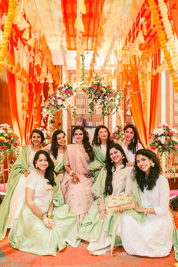 The festivities kicked off with a vibrant mehndi function. Gorgeous floral arrangements added a touch of freshness to the bold orange and fuchsia hues of the decor. In soft blush ensembles, the coordinated couple stood out against the explosive color palette of the event. The groom looked stylish is a contemporary fusion outfit by Kunal Rawal, while the bride accessorized her Knot by Kavya lehenga with statement jewellery that included polki and meenakari creations.