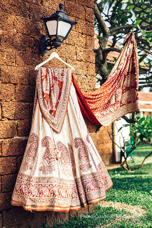 The sangeet night saw glamorous decor and a striking stage setup. The couple and their loved ones put up impressive dance performances that were choreographed by Monil Dhakan. The guests were also serenaded by the musical offerings A 26, one of the top bands of Goa. The groom’s stylish three-piece suit by Just Men complimented the bride’s shimmering crimson and blue lehenga by Manish Malhotra.