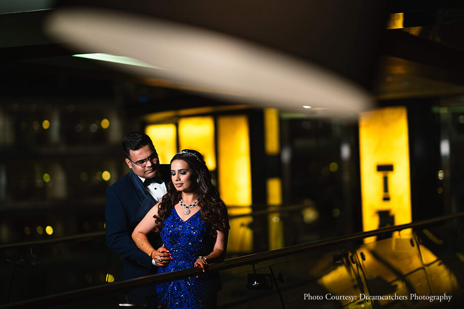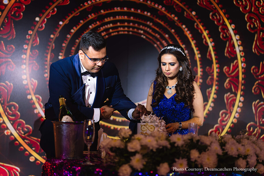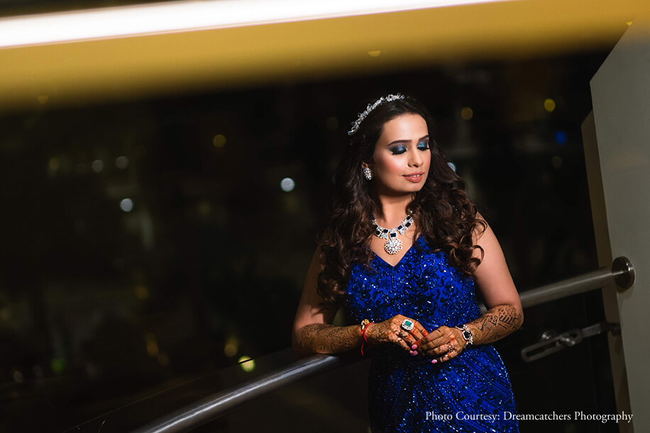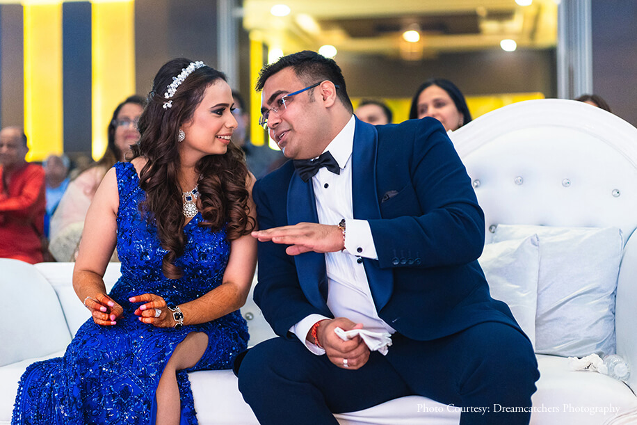 The fun sangeet followed a blue and silver theme. Kanchi recalls, “We always wanted a glam sangeet, and we got just that with a split LED entrance that set the tone for the evening. The evening was filled with dance performances by our family, a ring ceremony, and cake cutting after which everyone grooved to the tunes of DJ AJ, encouraged by the cocktails and shots.” Keeping the stylish theme in mind, Kanchi wore a sequin electric blue gown while Aditya chose a navy blue tuxedo.