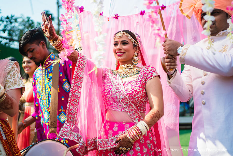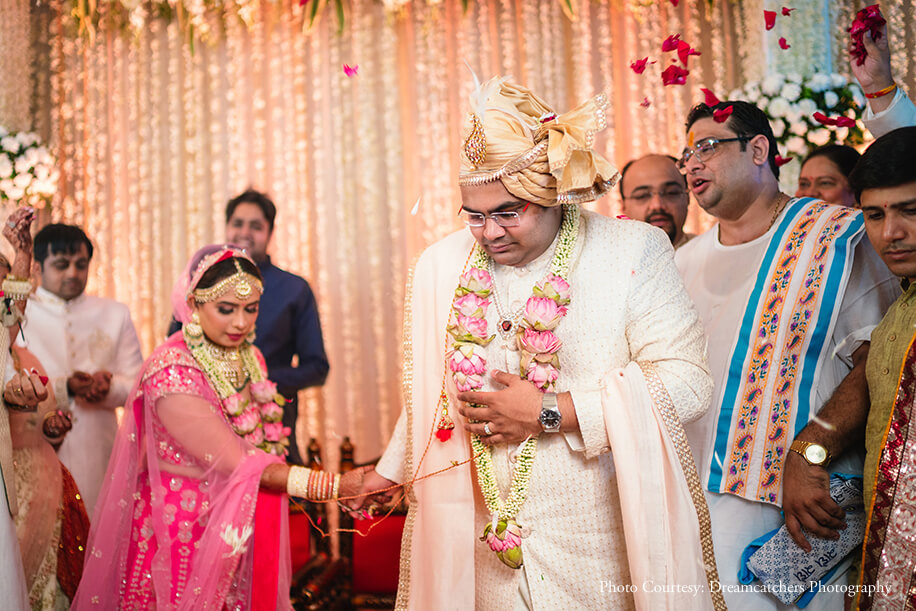 Aiming for a minimalistic wedding, Kanchi chose a white and pink color palette for the decor. She says, “We wanted minimalistic and elegant decor for our wedding which is why we chose a mandap with white flowers and drapes. Since I wanted a baarat of my own, my friends and I made our entrance dancing to Punjabi dhol beats right before the exchange of the garlands. However, the rest of the functions went ahead as per Gujrati traditions.” For her big day, Kanchi chose a fushia pink lehenga, and Aditya complimented her in his ivory sherwani.