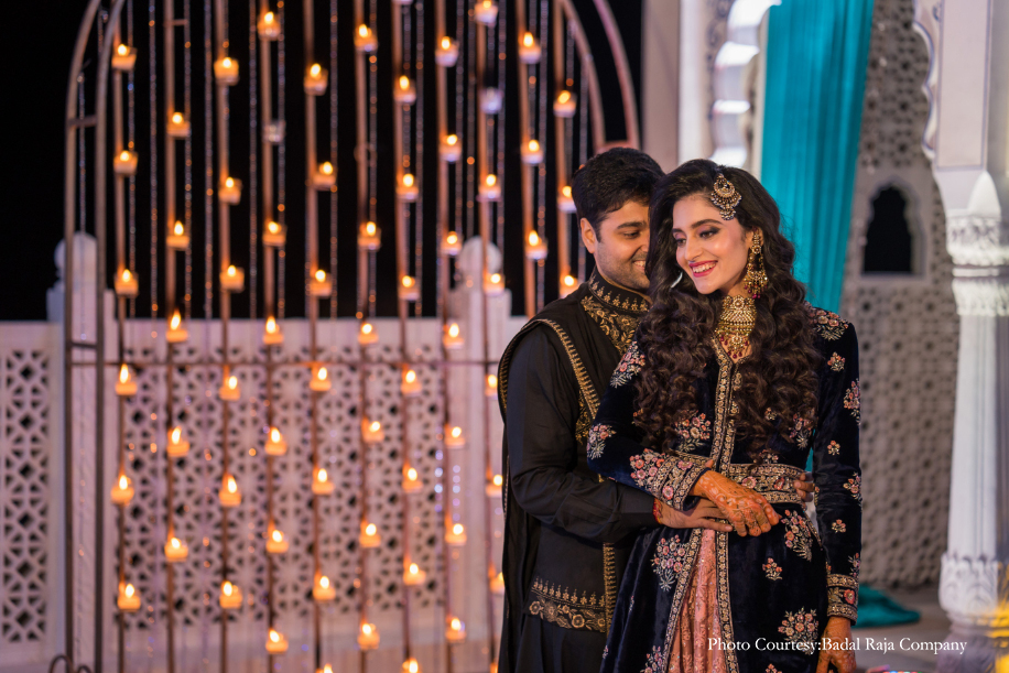 We wanted the decor to evoke a Mughal vibe so we used a lot of blue drapes and blue lighting. The setup also included large candle panels that added to the beauty of it all. An ensemble by Sabyasachi was my pick for the evening while Chetan wore an outfit by Amit Arora.