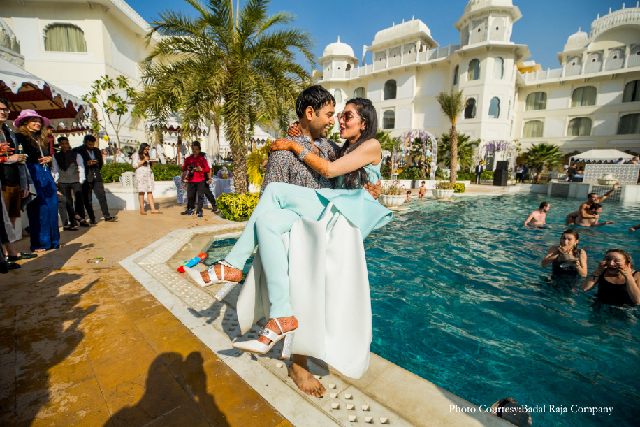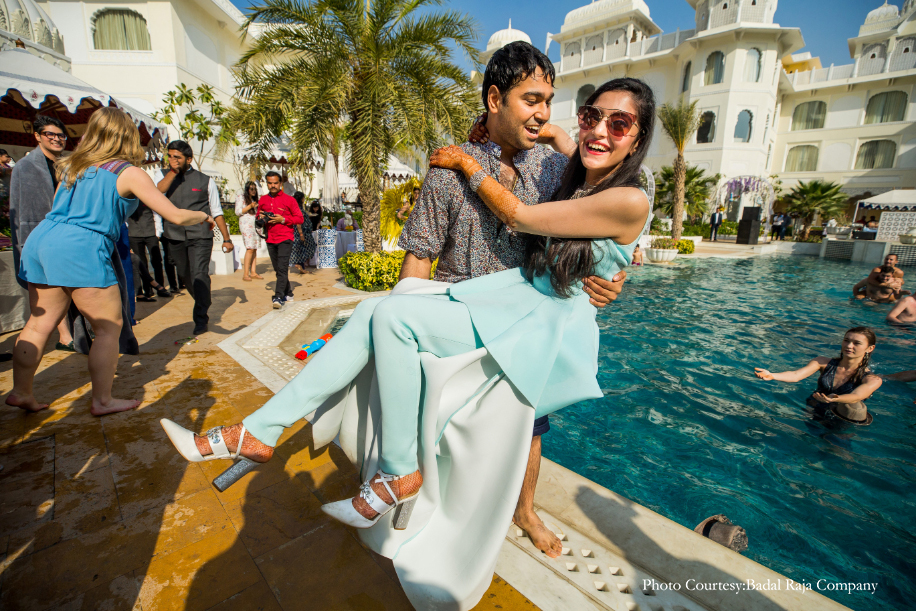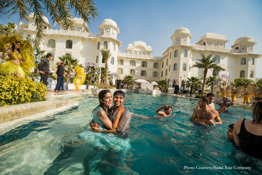 Our pool party at the JW Marriott Jaipur Resort & Spa was a day event. Since the hotel itself is so pretty, we avoided additional decor. We did, however, place several white arches decorated with purple vines throughout the area and invited entertainers to add to the cheer of the party. I wore a pastel blue jumpsuit while Chetan opted for navy shorts and a shirt.
