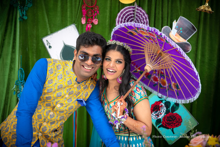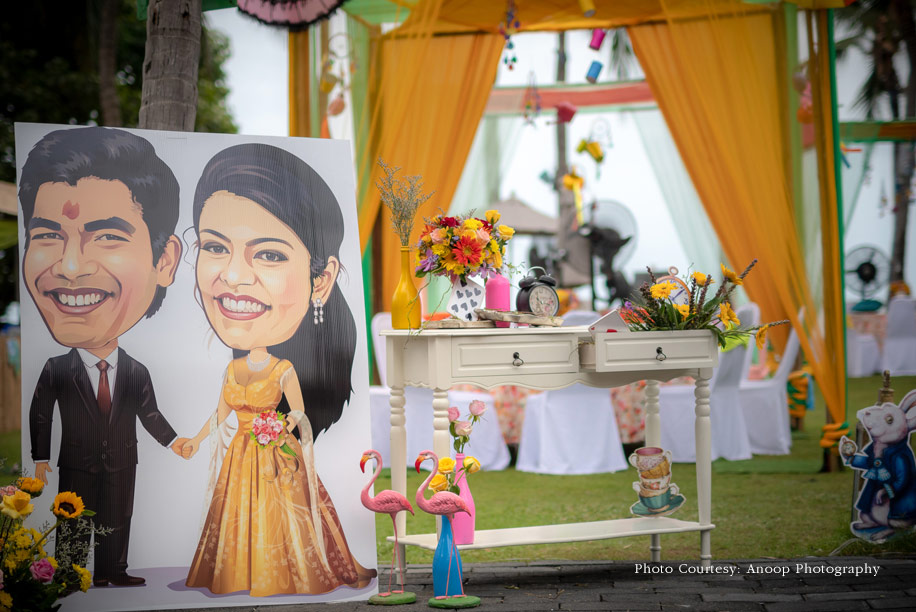 “The theme for this function was ‘Wonderland’ with a very whimsical vibe rendered in decor elements. Pink flamingos, teapots, flowers, and balloons were incorporated into the bright, colorful setup. We had several game booths to make it more interactive and our guests loved that! I wore a blue lehenga by Abu Jani Sandeep Khosla and Abhinav complemented my outfit in a blue kurta pyjama and yellow bandhgala from Diwan Saheb.