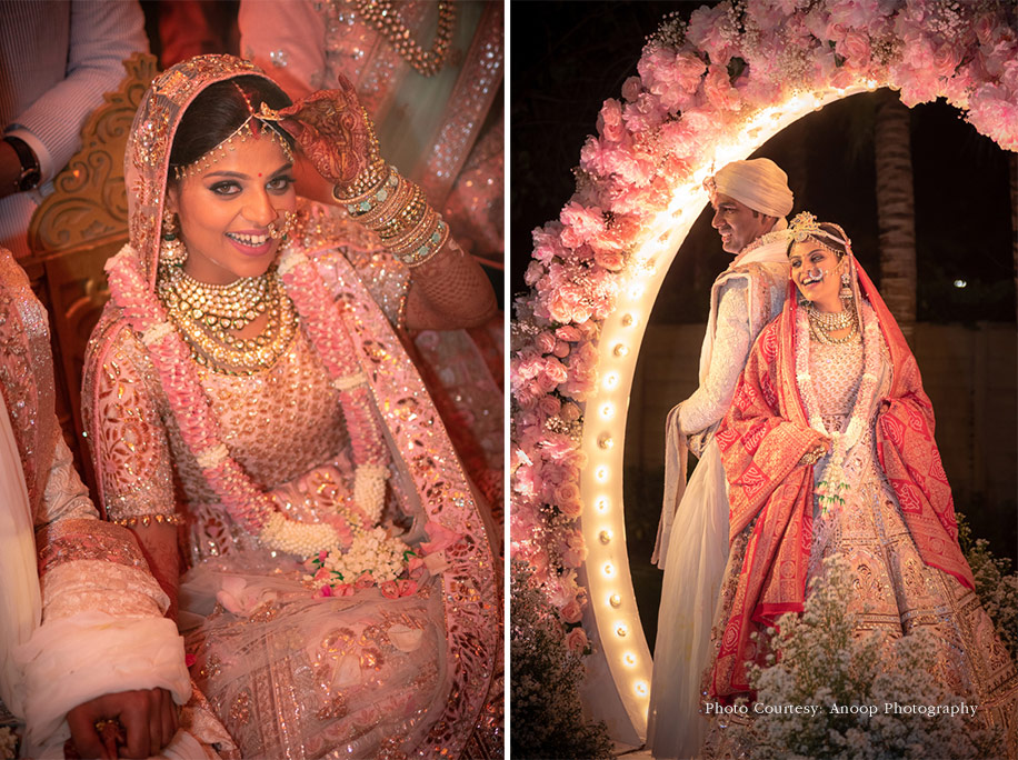 “Our wedding decor was in shades of pink, white and gold with lots of fresh flowers used to create an atmosphere of romance. Our mandap stood against views of the unending ocean. The setting couldn’t have been more perfect. Abhinav and I wore lighter colors that went with the wedding color palette. I opted for a pale pink lehenga by Manish Malhotra. He dressed in a sherwani by the same designer. The wedding was followed by an after party.”