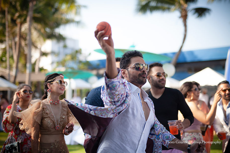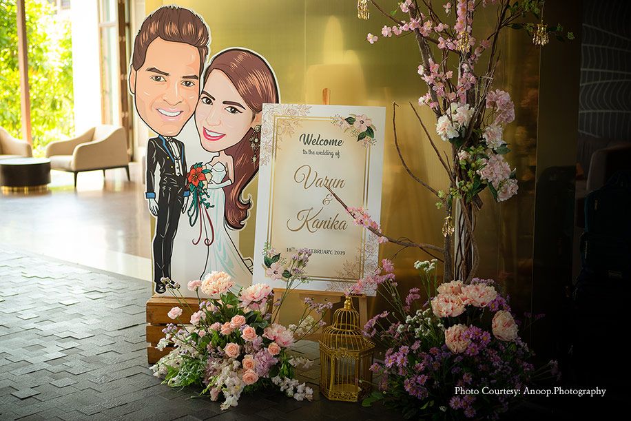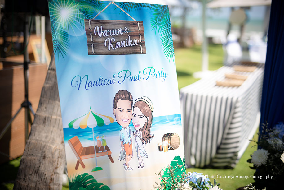 The first day of the celebrations began with the welcoming of the guests who were greeted by cheerful blooms and kaleerein decorations, and life-size caricature portraits of the couple which served as a photobooth. This was followed by a pool party where the decor was done up in beachy hues of blue, and included giant jenga, beer pong and live food stations.