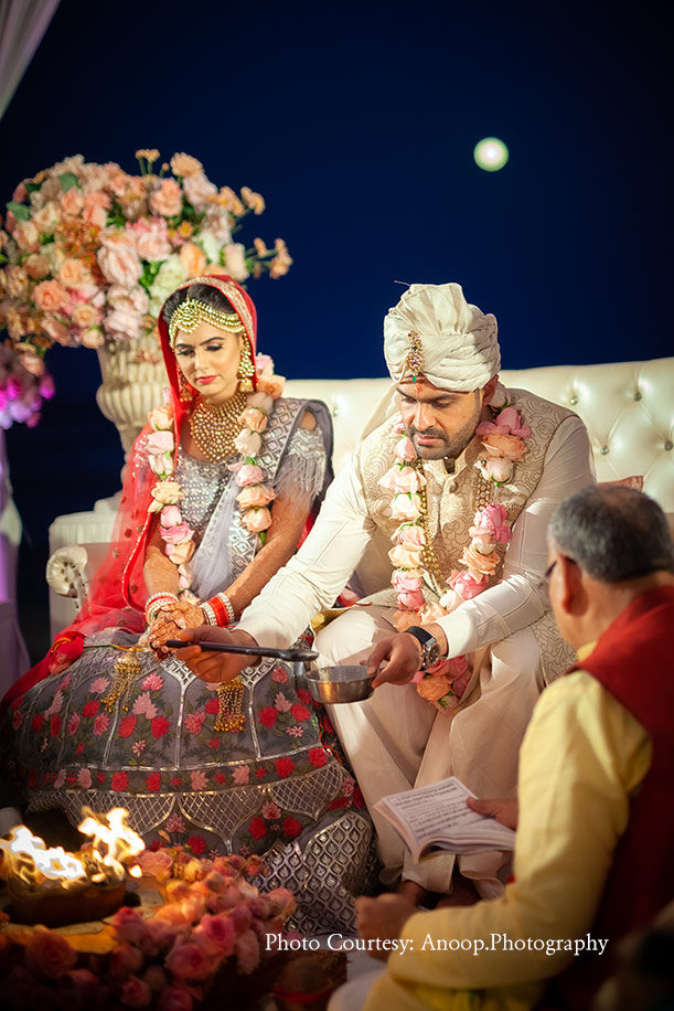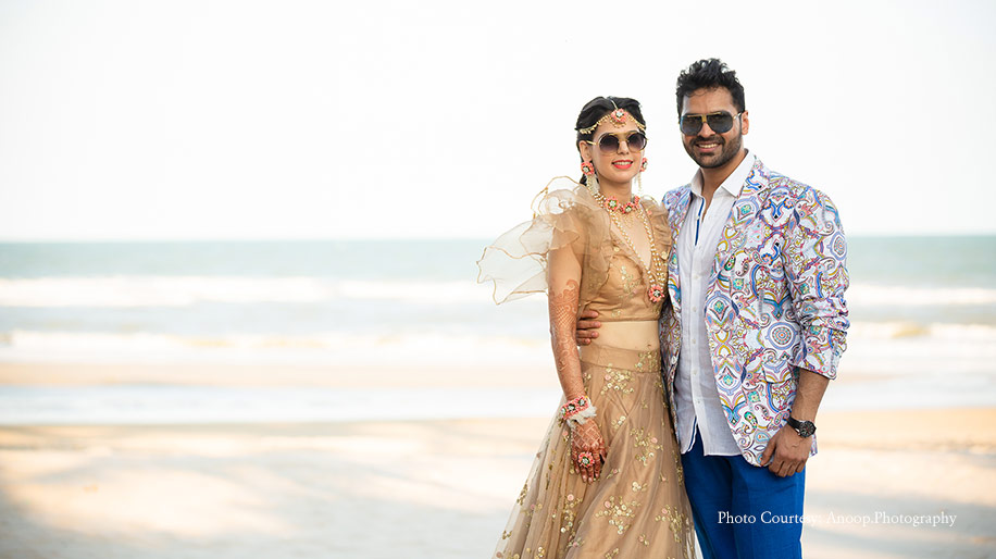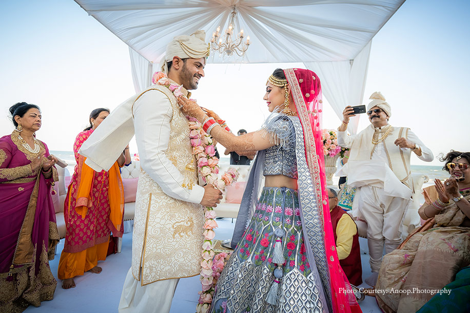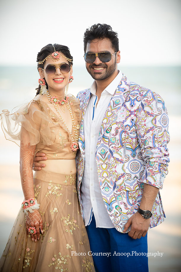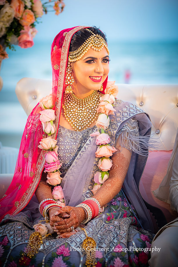 The sunset wedding was a fusion of soothing peach and ivory tones on the pristine sand beach of the resort. The groom wore a Tarun Tahiliani creation in beige with a bandi jacket that featured gilded embroidery. The bride’s lehenga from Frontier Raas was a greyish-blue beauty that featured a pattern of lotus blooms that matched the fuchsia of her dupatta. She completed her look with bridal jewellery comprising pearls and polki elements.