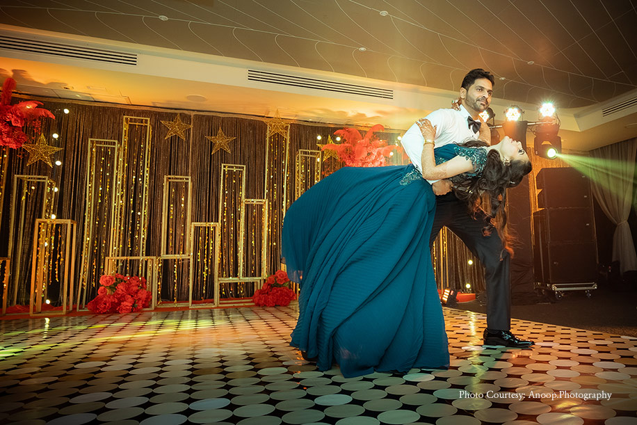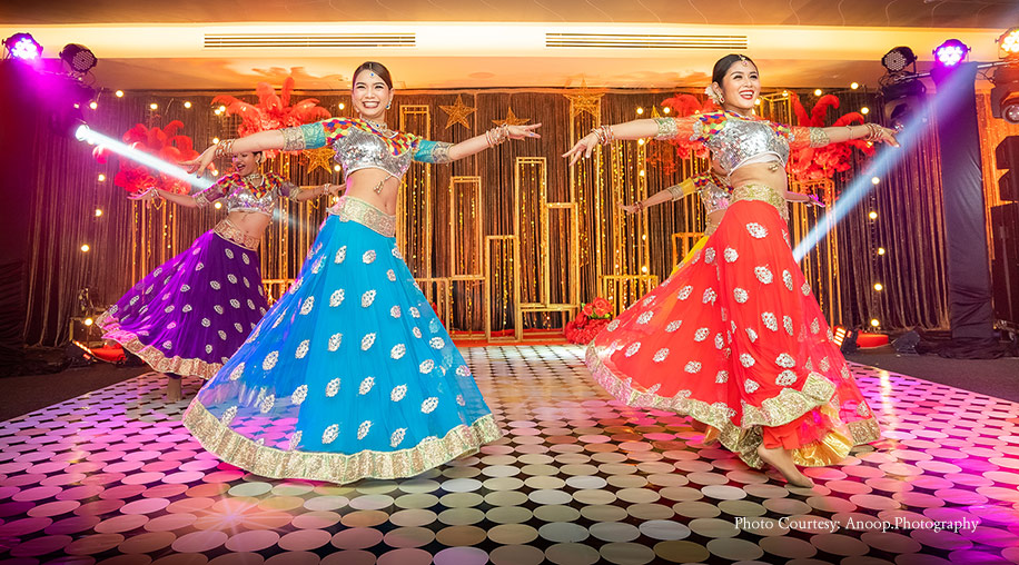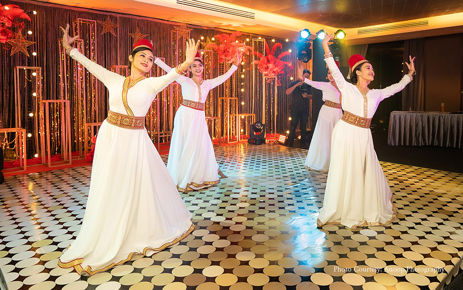 As the evening progressed, the pace of the festivities picked up. Designed around a red carpet theme, the black, red and gold color palette of the decor created a dramatic yet sophisticated vibe for the evening. Several dance performances entertained the guests, which were followed by performances by the couple’s families.