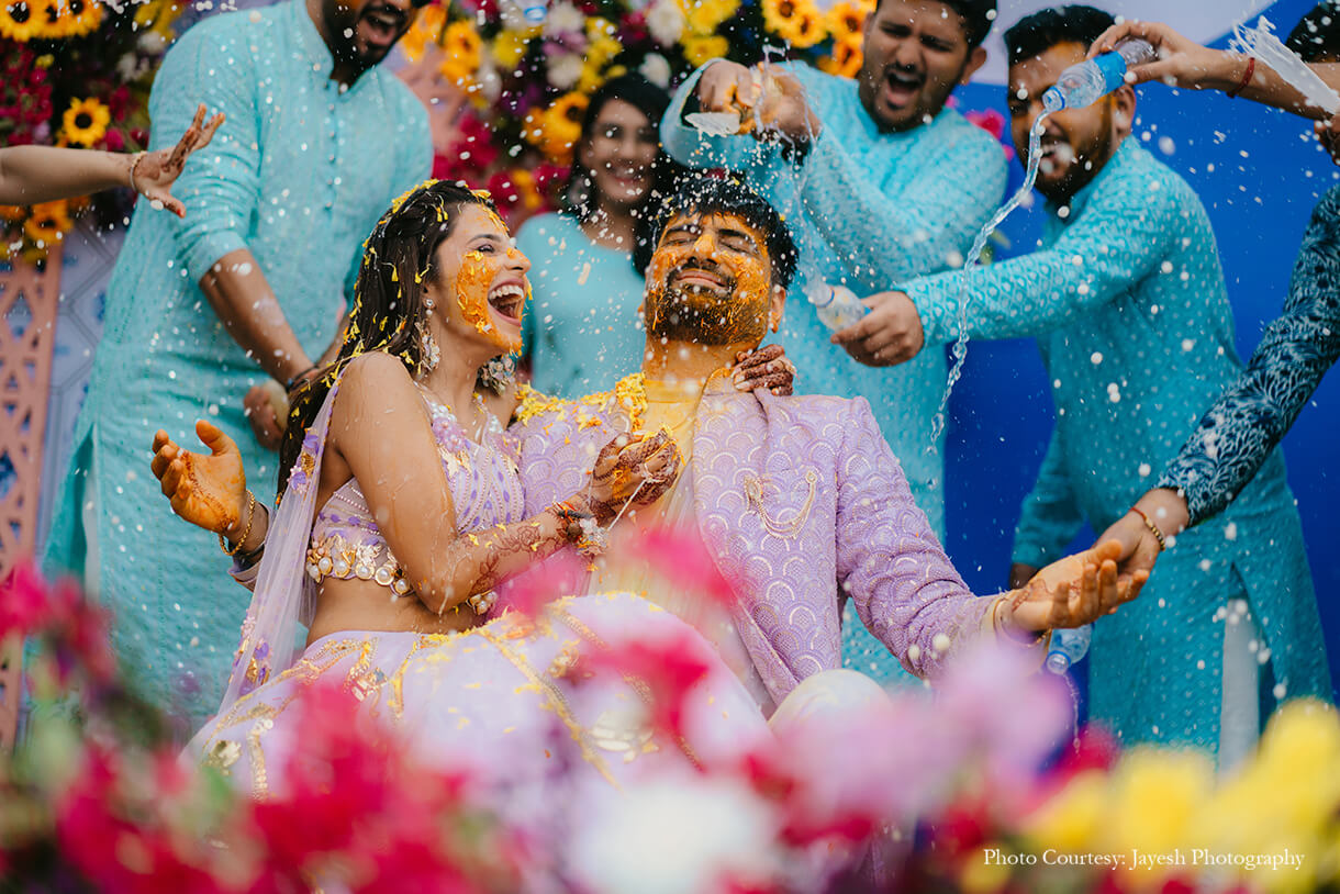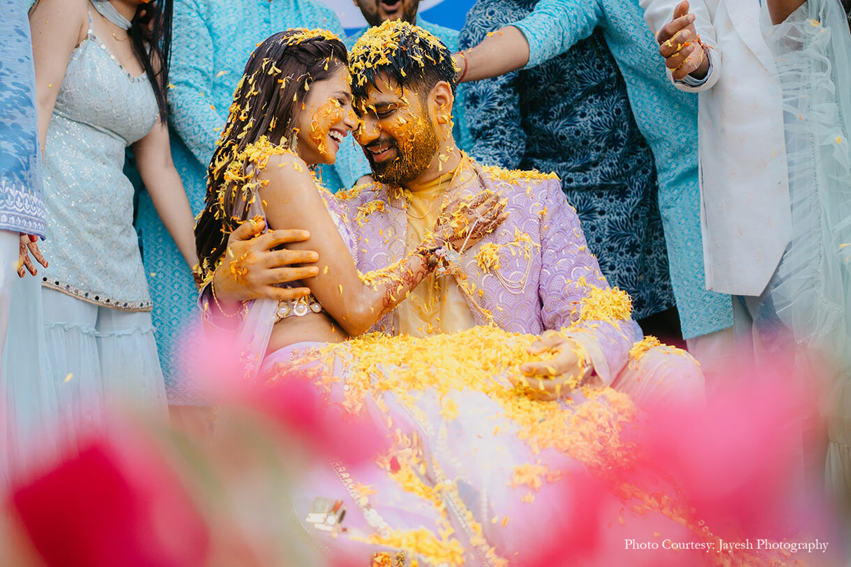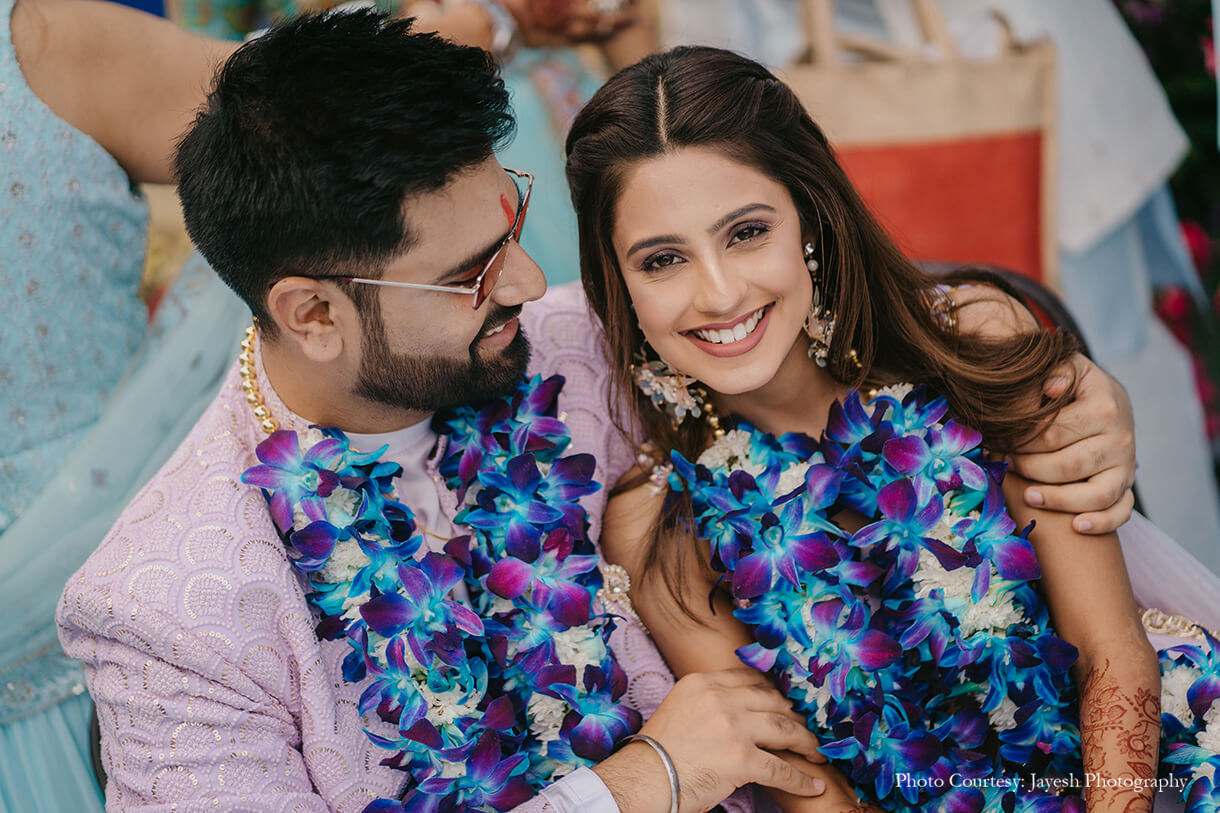 The festivities started on a high with a lively haldi soiree that was fun and fabulous. Imagined with an unconventional blue theme, the occasion saw the decor of refreshing pastel hues, flowers, and quirky elements that added to the eclectic atmosphere. The couple’s friends and families swapped out the usual yellow dress code for stunning blue ensembles, while the bride and groom sported matching lavender outfits for a welcome surprise.