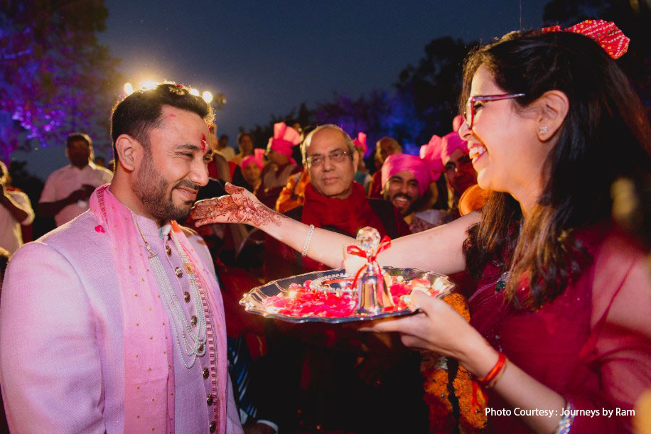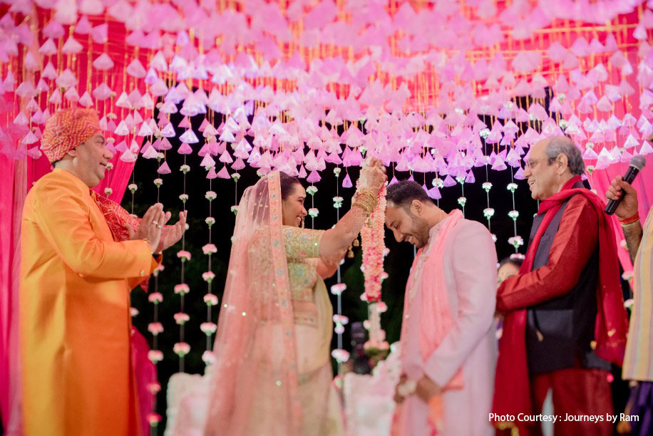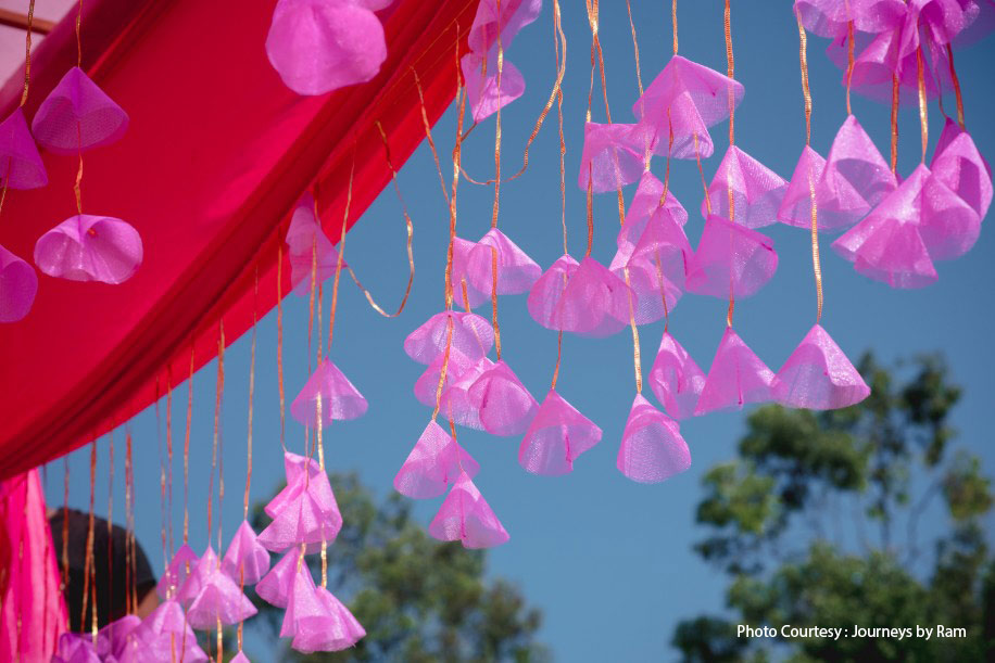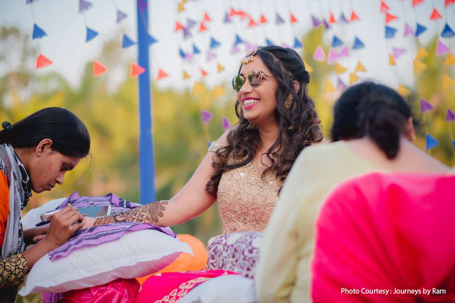 “Anuj’s family has a tradition of having ‘Mehndi Raat,’ and this was also something that his mother wanted. So we decided that we would start the function by 3:30 pm and let it go on till about 8:30 in the night. We wanted the decor to be vibrant and colorful because Anuj loves bright colors. However, we wanted to achieve this without touching upon themes that have been overdone. So we made use of triangular tassels in electric blue, orange, fuchsia, purple and yellow. The focal point of the decor for this function was the canopy that had been created using these elements. There was a ‘shikara’ (Kashmiri boat) which had been used by the hotel as part of their decor. We asked them if we could use that for our function and they agreed! It added a special touch since Anuj is originally from Kashmir. We converted half of the area into a dance floor and also put up a big screen for karaoke so that everyone could have fun. I wore a bright pink tulip skirt with mirror work and a golden blouse for this function. It was created by Vaishali, who is a designer based in Malabar Hill, Mumbai. I paired the outfit with some funky gota jewellery, and I was mehndi-ready!”