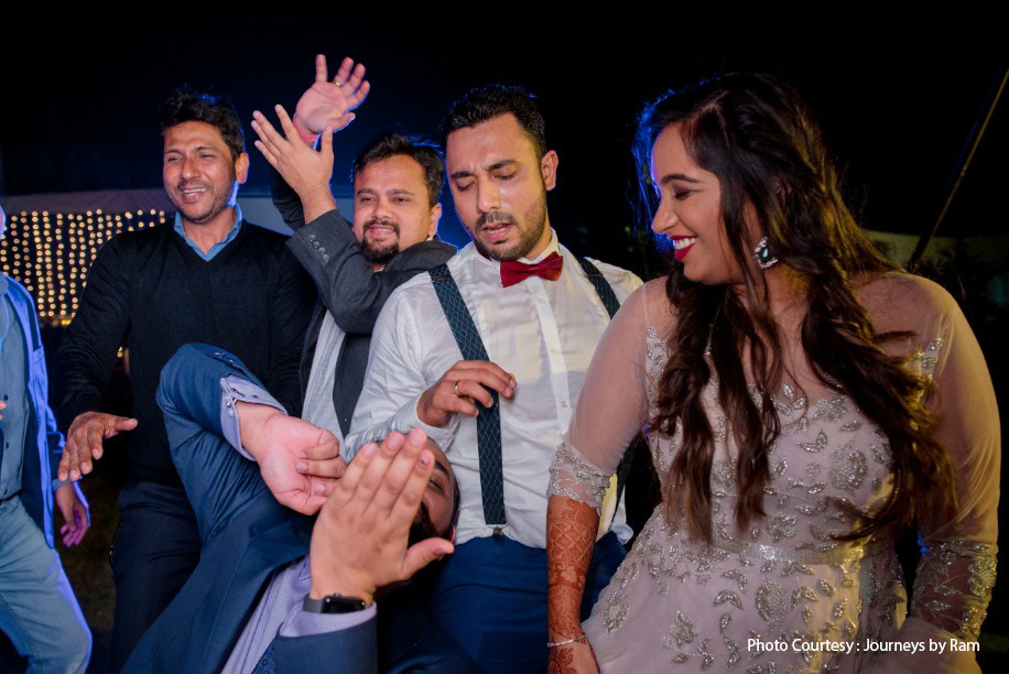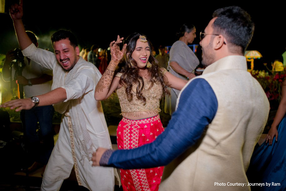 “We decided to swap our reception for a sangeet since we thought that our guests would have had enough time to meet each other by now considering this was a destination wedding. By having the sangeet on the last day, we were able to keep them entertained and involved for some more time. My best friend who had forever wanted to choreograph the dances for my sangeet got a chance to fulfill her dream. Believe it or not, the decor for this event was decided two days before I left Hyderabad. I was so nervous, and didn’t know if the decorators would be able to pull this off, but they surprised me by doing such a fantastic job! I wore a maroon velvet lehenga that I bought from Sionnah in Khar.”