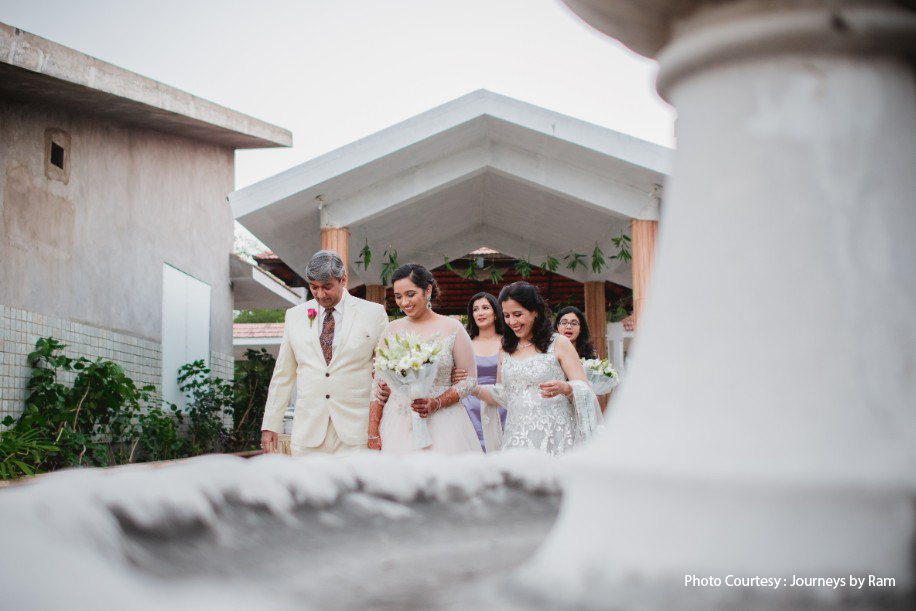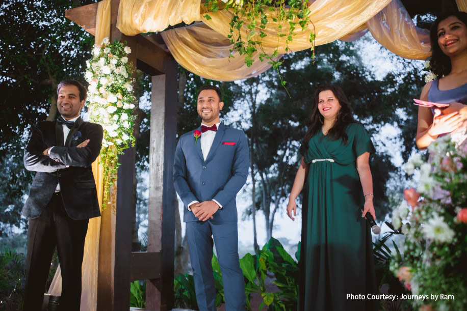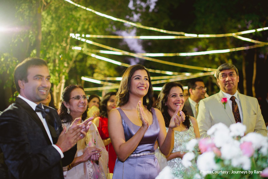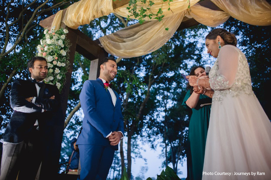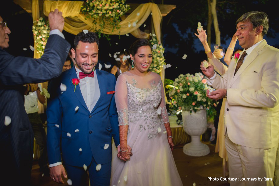 “This was the most important function for me. I have grown up watching American movies and love the simplicity of white weddings. I had dreamt of a wedding like this all my life. When we came to this property for the first time, we couldn’t figure where we were going to take our vows. We wanted to this to be special, so Anuj told me to take a walk with him. We chanced upon this unpaved walkway which led us to the perfect spot. It had just enough space to accommodate all our guests, an aisle, and a small stage. It had arched trees when I stood there I knew that was it. We went back to the General Manager of the hotel and requested him to make that space available for this ceremony. He had the floor leveled, the bushes trimmed and the area ready for the setup. The decor boasted neutral hues since we wanted the whole vibe to be very chic and elegant. Silver, champagne gold, and white were the colors we used, and we played with lots of fairy lights across trees for that ethereal atmosphere. Since this wasn’t a Christian wedding, we took the liberty of tweaking a few things to make this function more meaningful to us. Instead of having a priest, my friend from my MBA times, who was also my roommate, served as our marriage officiant. She knew both of us from day one and knew our story, so it just made more sense to have her conduct the ceremony. The ceremony went on for about 45 mins during twilight. What’s funny is that I wanted this since I was 15 but neither Anuj nor I had our vows in place until 5 pm. But I am so grateful that I got my dream. It was a very emotional moment.”