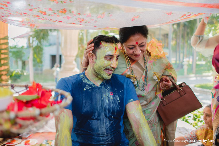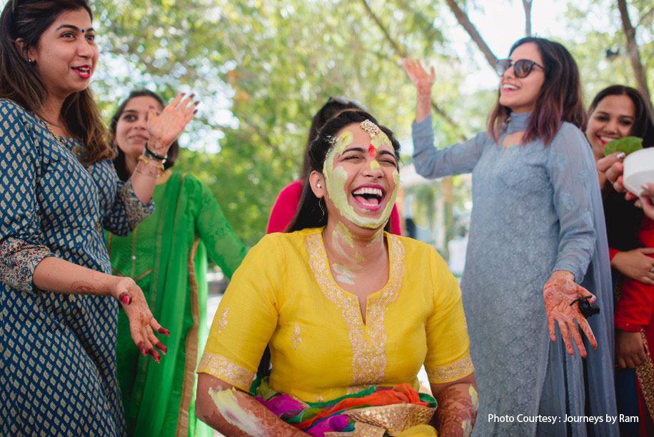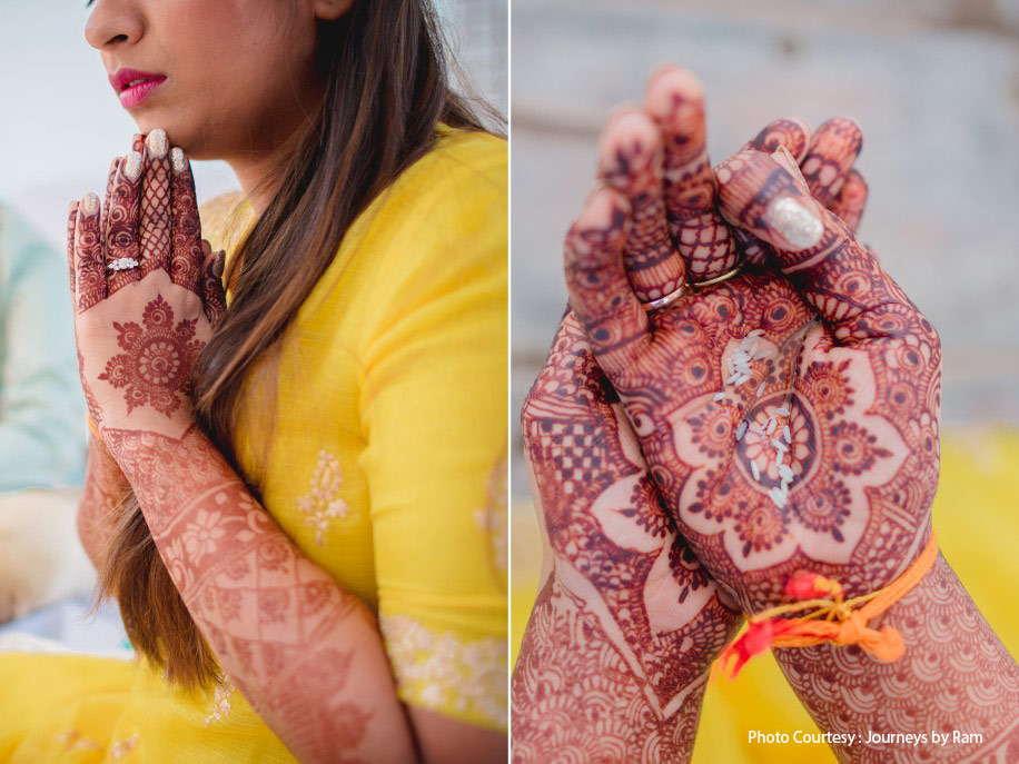 “We clubbed the haldi with a Ganesh pooja. We even had the hotel lay out the breakfast in this area itself so that everyone got to move around and interact with each other. There were frames for photo ops, and we put kites for those who wished to fly them. Keeping in line with the theme, I wore a Patiala suit that had a yellow kurta and a colorful dupatta.”