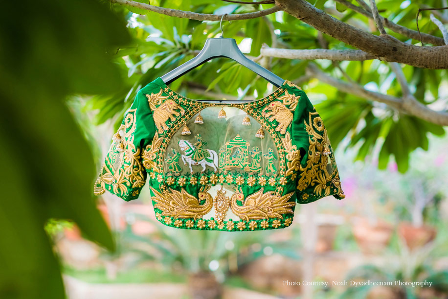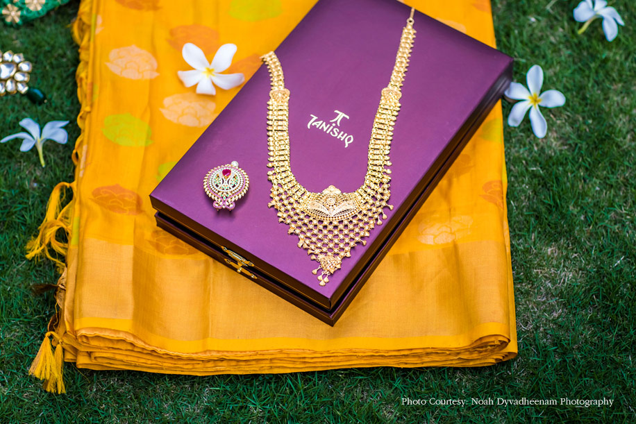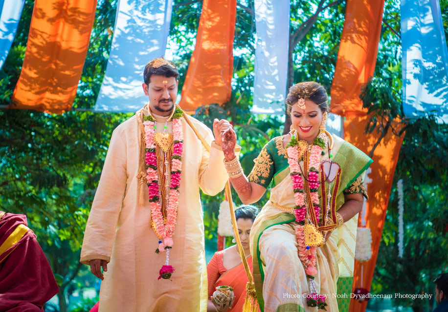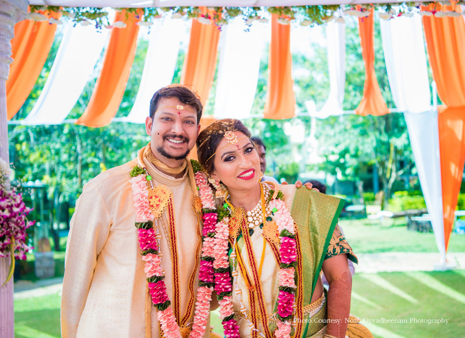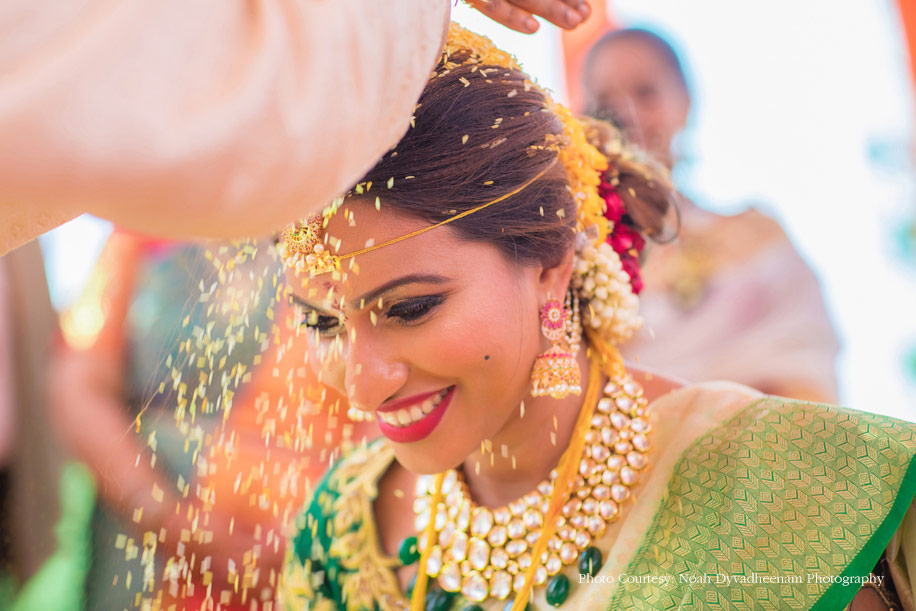 The couple had a traditional Telugu wedding ceremony. The mandap was beautifully decorated with lush floral arrangements and drapes. For the wedding, Kavea wore a traditional Kalaneca saree that was woven by weavers with specific instructions from the bride who wanted silver color threads in the form of a ‘Raja and Rani’ in the pallu, and a combo of cream and dark green for the ‘talambaraalu’ (Telugu wedding ritual).