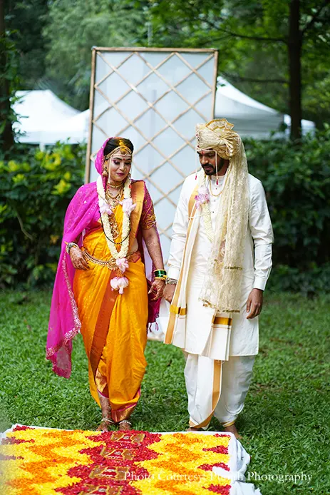 Giving us an overview of the wedding and how they translated the couple’s dream into a reality, Ninad Nerkar from Flinters Management shares, “The bride had complete clarity on what she wanted for every event and hence it was easy to follow her lead. For the reception, the bride wanted an informal setting. Hence we fused the Sangeet and Reception together and added a monochrome stage to the festivities where everyone could take a look at the performances. The wedding which was adorned with bright marigolds, also reflected both their respective Maharashtrian and Kannadiga cultures. We’ve known the couple for more than a year and we had an accurate idea about their tastes. They wanted a well-balanced celebration where nothing was too less or too over the top. Kavya has a very classy, elegant taste and we incorporated that in every element be it the mandap decor, the phoolon ki chadar, the entrance arches or the saptapadi.”