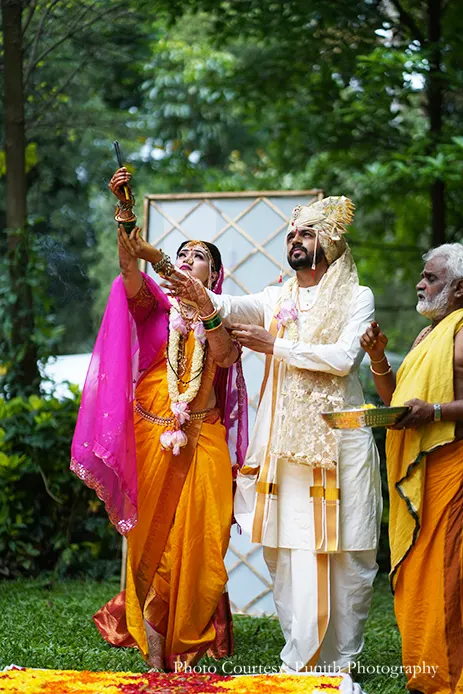 Vibrant and brimming with heartfelt moments, Kavya Deveraj, a model, and Tejas Rao’s fusion wedding was a perfect fusion of time-honored traditions meeting contemporary sensibilities. Hosted at the luxurious Taj West End, Bengaluru, this wedding was surrounded by the bounties of nature which accentuated the beauty of the union. Also, to ensure that everything went ahead exactly as envisioned WeddingSutra Favorite – Flinters Management took charge of the planning and decoration and stunned everyone with their creativity at this pandemic fusion wedding.
