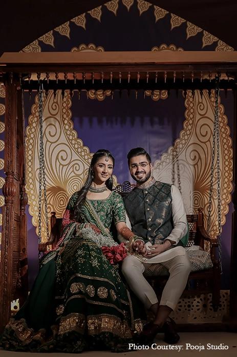 A vibrant musical night of festivities full of traditional flavors kicked off the Mehndi and Sangeet. Imbued with rich jewel tones of emerald, amethyst and gold, the evening was set with bold color-blocked decor bathed in the magic of sparkling fairy lights. The couple wore coordinated ensembles of emerald green as they hit the dance floor with their loved ones.