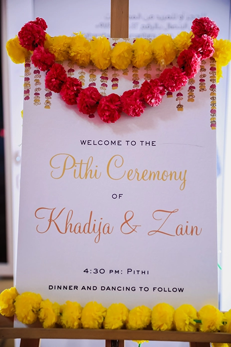 The picturesque Banana Island Resort Doha by Anantara welcomed the guests to the Haldi ceremony of Khadija and Zain. The indoor function was given a lively, breezy feel with billowing white drapes and tones of marigolds. A beautiful curtain of marigolds duly complemented the fuchsia toned brocade setting for the ceremony which painted a pretty picture on the stage. Dressed in a richly embroidered yellow sharara set with floral jewelry, the bride entered with her family under a phoolon ki chadar, while the mustard-clad groom made a surprise entry cycling in with his entourage.