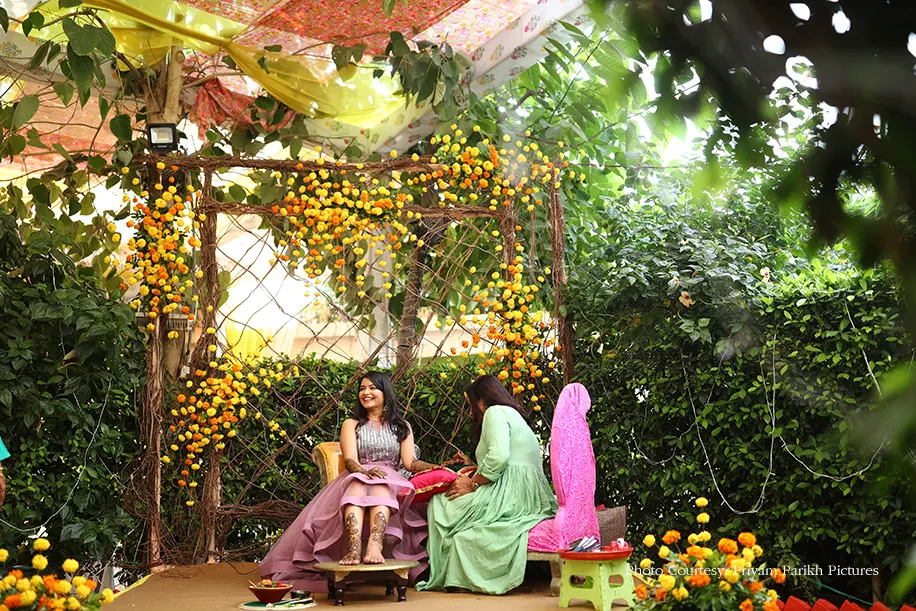 The festivities kicked off with an intimate Mehendi function for the bride. Dressed in a charming lavender flared skirt and crop top, the bride looked radiant against natural greenery and the bright floral décor of marigolds as she got her hands dyed with henna.