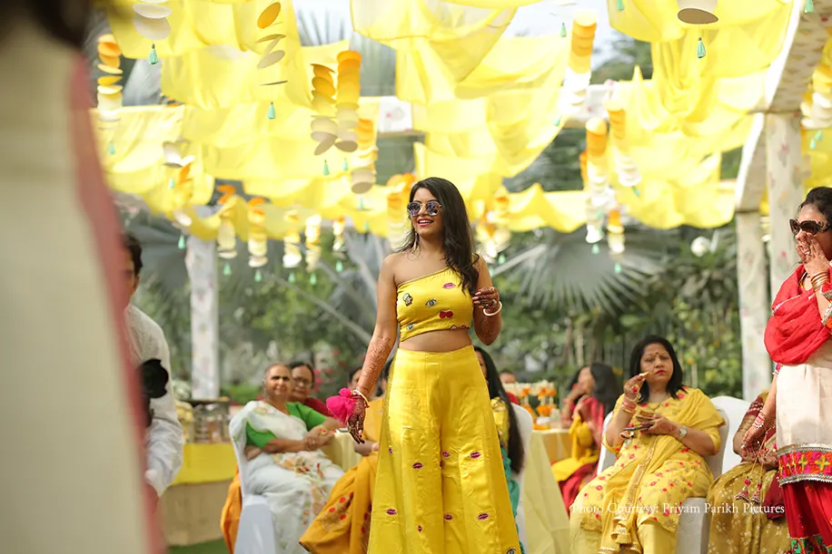 The haldi ceremony had a yellow and white origami theme with quirky paper décor and flowing drapes in ombre hues. Each table was decked with a unique floral centerpiece. The day function was laidback and relaxed as everyone enjoyed with fun games and music, including surprise performances. The bride rocked a cool crop top and flared pants ensemble for the occasion, as she was doused with turmeric paste and showered with rose petals.