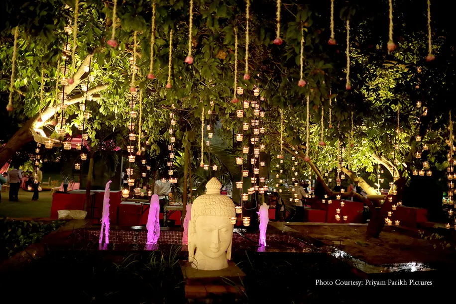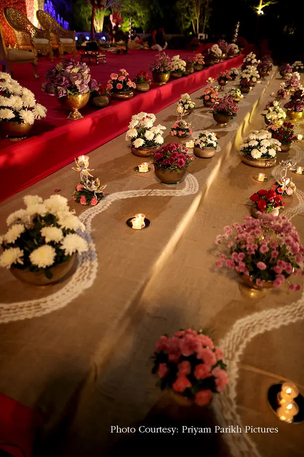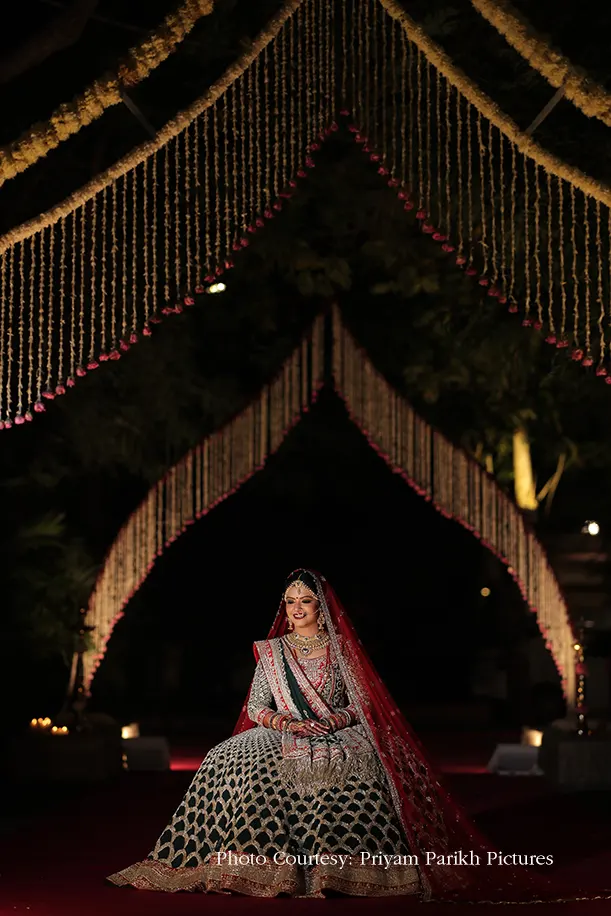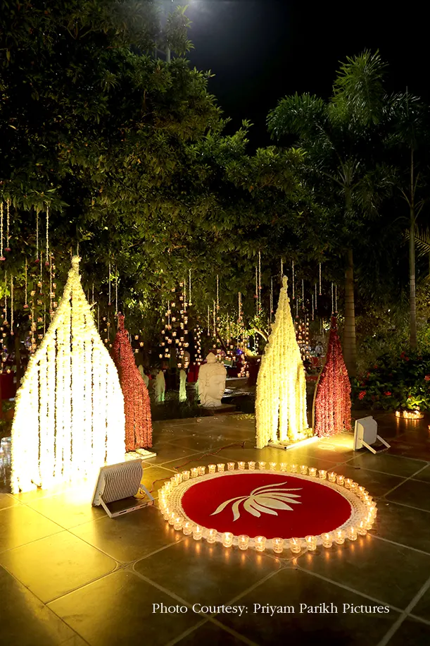 The wedding was a breathtaking floral extravaganza which brought the couple’s vision of lotus flowers and lamps to life. A lotus petal shaped passage-way strung with rajnigandha flowers welcomed the guests to the occasion, and as they stepped in, they were awestruck with the abundance of flowers in the verdant, open space. The grounds were covered with flower pots, installations, rangoli and more, in hues of pinks and reds bathed in the glow of thousands of diyas that lent a magical feel to the evening. The colossal lotus shaped mandap flanked by fountains and planters however stole the show. The bride wore a rich lehenga in green and red, while the groom looked regal in a beige and green sherwani.