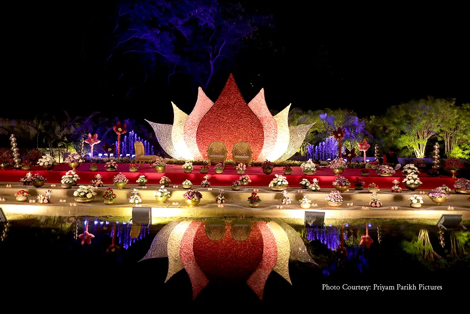 The awe-inspiring lotus stage at this beguiling farmhouse wedding is sure to leave you transfixed!