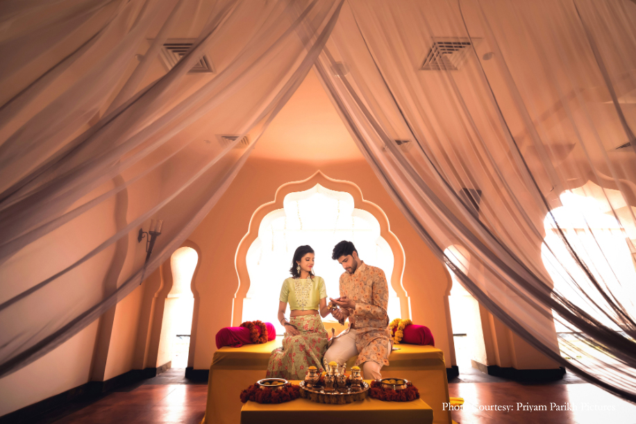 The couple wanted a royal destination wedding but not the usual Rajasthan route. While looking for something unique, their wedding planner suggested the magnificent Evolve Back Kamalapura Palace, Hampi.