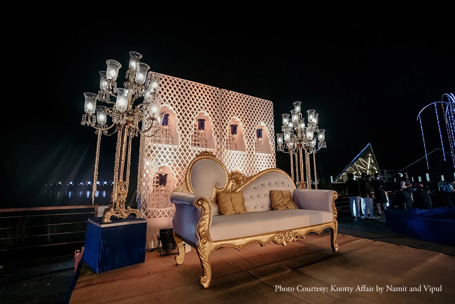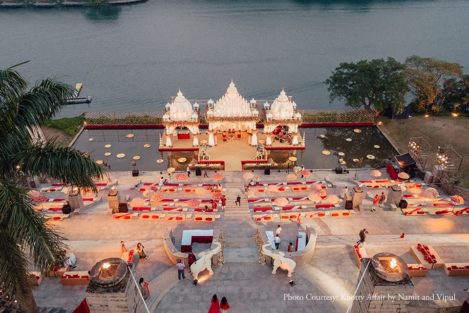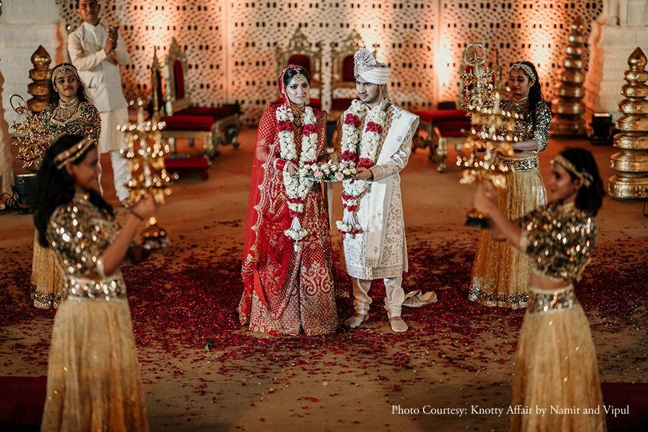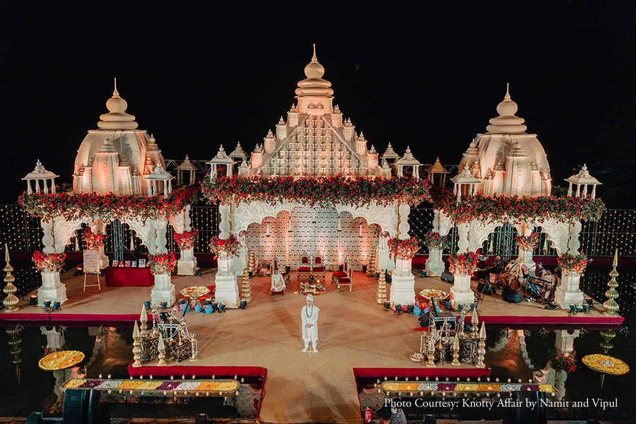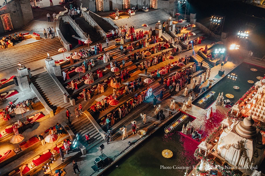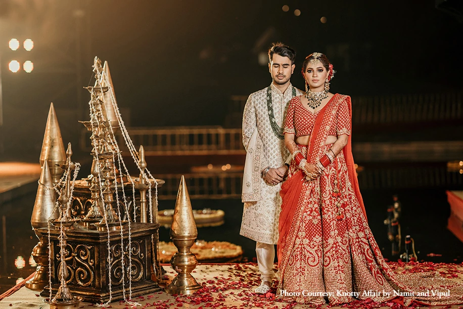 The wedding was hosted amidst traditional splendor of the Benaras Ghat venue of Aamby Valley that re-imagined the auspicious aura and ambience of the iconic religious destination. Décor of red and gold adorned the traditional white temple architecture, enhanced by candle and diya stands, flowers and other heritage accents. The groom donned an exquisite ivory and gold sherwani, while the bride exuded royalty in quintessential bridal red.