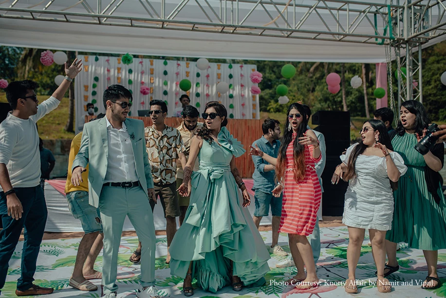The bride and groom arrived for the pool party amid cheers, balloons and colorful smoke bombs. The breezy poolside festivities saw vibrant décor of pink and orange that was witness to a rain dance amidst gleeful moments. The bride and groom opted for fresh sky-blue hues for the event.