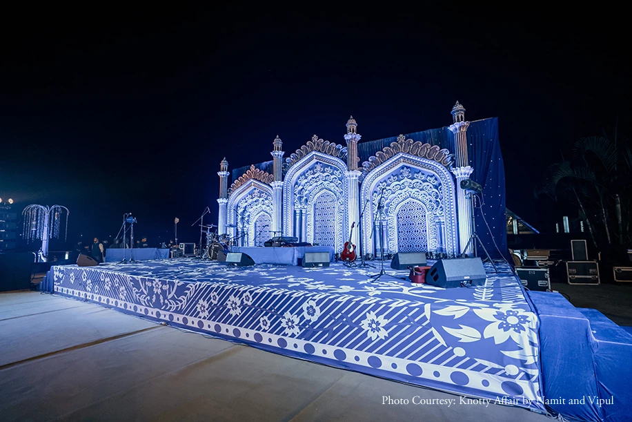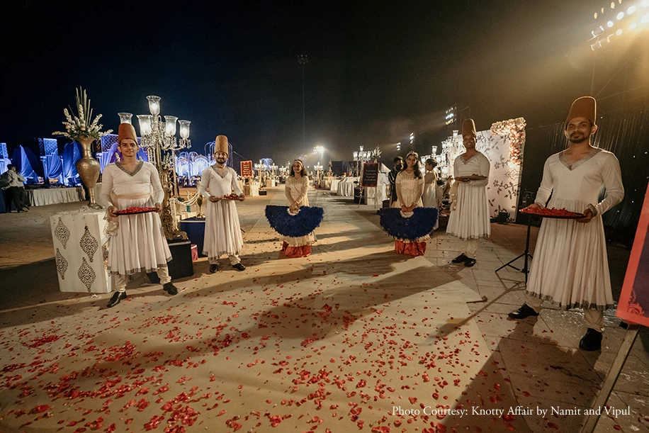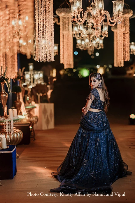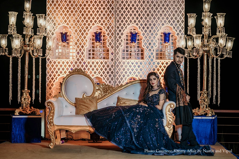 Inspired by the nuances of Mughal architecture and splendor, the Sufi night was embellished with magnificent interiors of white and gold, with vintage chandeliers, flowers and more. Professional Sufi singers entranced everyone with their melodious tunes. The groom dazzled in the Nawabi elegance of his Qbik ensemble while the bride wore an enchanting midnight blue lehenga by Dolly J.