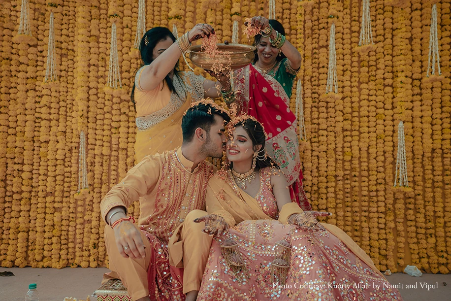 Ensconced in a sunny décor of marigolds, the Haldi function saw an abundance of laughter and joy as the couple were doused with turmeric paste by their loved ones amidst a revelry of music and dance. The couple looked radiant in self-designed coordinated outfits of citrus hues and sparkling embellishments.
