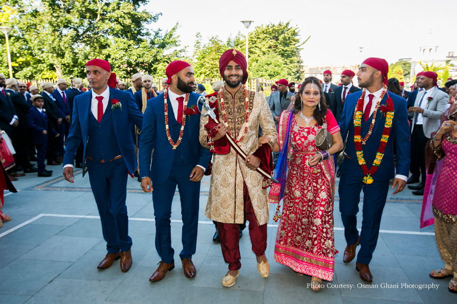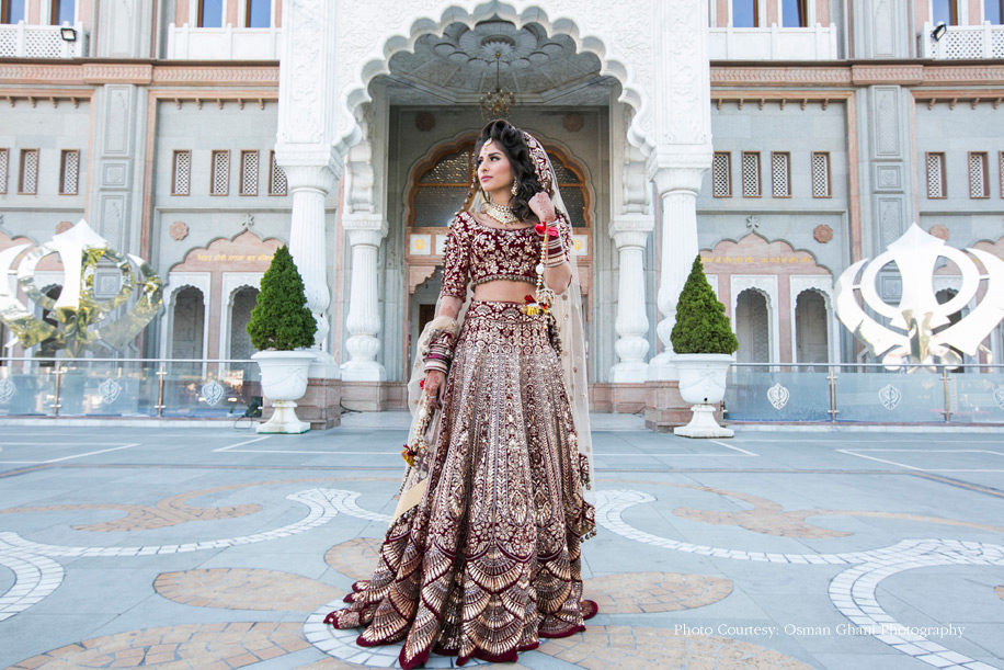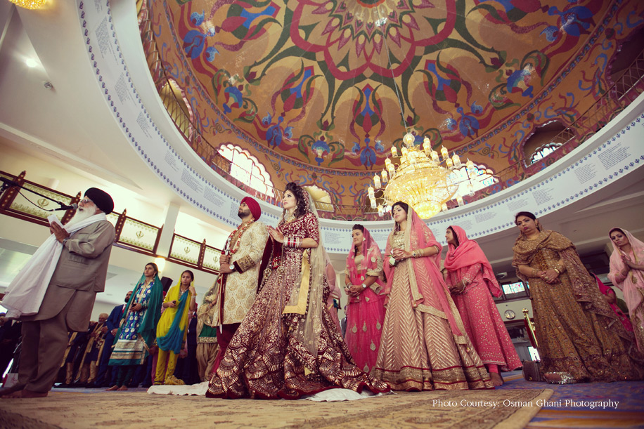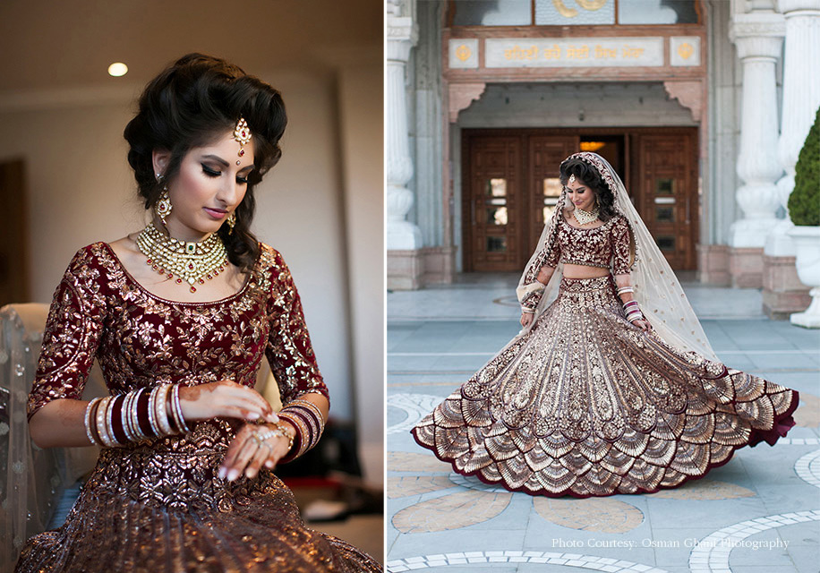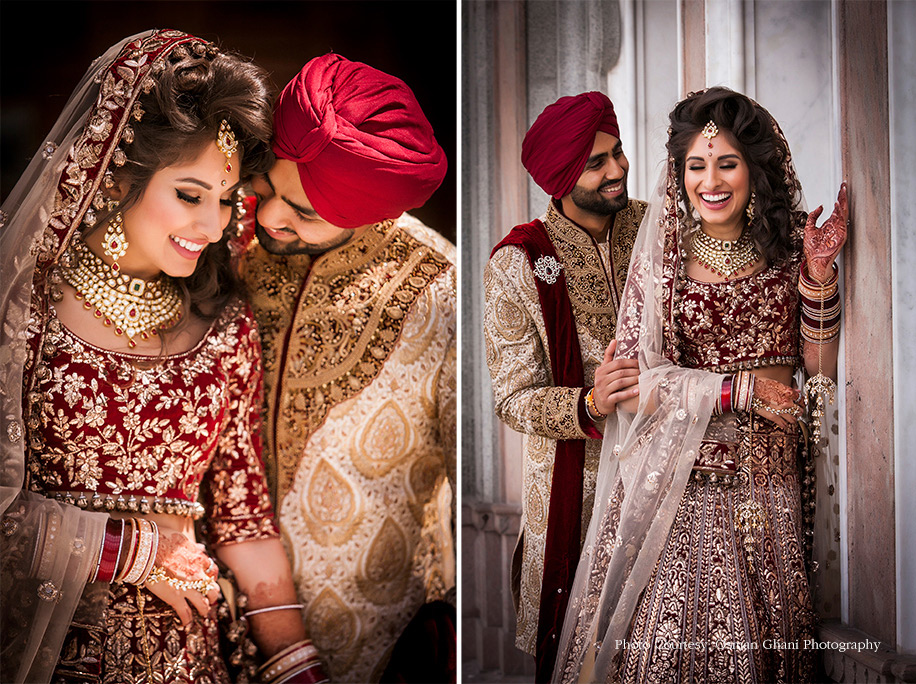 “Amar and I had a Sikh Wedding ceremony in a Gurudwara. I wore a red and gold Bordeaux lehenga by Manish Malhotra that featured hand embroidery rendered in a flattened metallic wire. The skirt came with a custom made blouse and I loved the rich colors of this outfit. It was my favorite despite the fact that it weighed about 14 pounds! To complete the look, I wore a handpiece and chooda by JazziBindi and a cut glass and gold necklace with earrings and a maangtika. Amar wore a gold and red sherwani that was bought from Lals in London.”