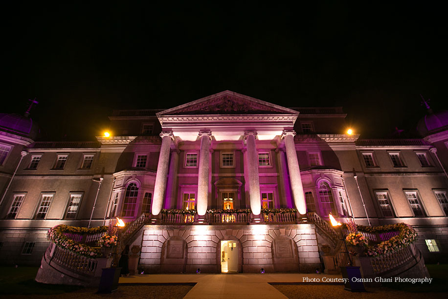 Wrotham Park is a neo-palladian English Country House Mansion located in Hertfordshire surrounded by 300 acres of parkland. There are no words to describe the house; a truly magnificent building surrounded by perfectly manicured lawns. As soon as we saw it we could not get the image of it out of our heads. Not many Indian weddings take place at Wrotham Park, so there was also its exclusive appeal. The house is full of old paintings and portraits. The French windows open out to a grand dual stone staircase that overlooks the grounds.”