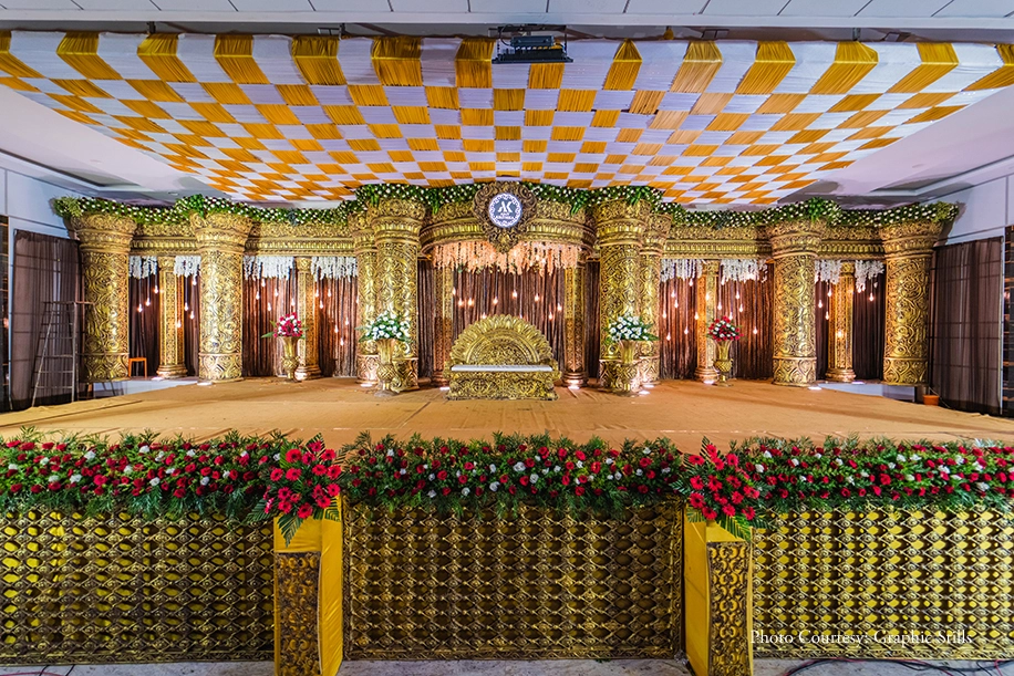 Hosted in the groom’s hometown of Nagercoil, the couple’s second reception was glitzy and exuded grandeur with its golden hues and rich foliage that decorated the entire venue including both the interior and exterior spaces of the hotel. The reception made jaws drop with its colossal stage where the newlyweds greeted their guests. Dotted with a plethora of counters that indulged the guests’ appetites and entertained them, the reception was truly an engaging and lively event.