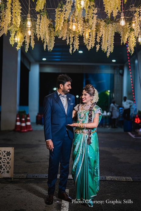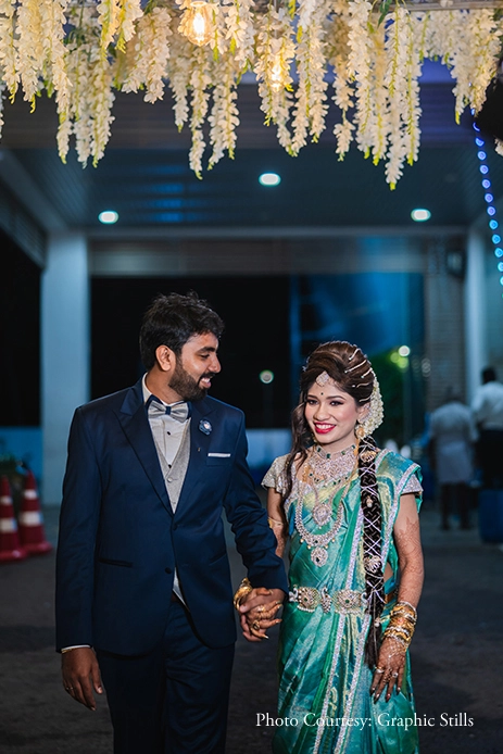 Kirithika shares, “Initially slated to be hosted at home, we chose to shift the event to a hotel in lieu of practicing social distancing. We chose a traditional marigold decor for the event with brass wares throughout the ballroom. However, Ajaiy took me completely by surprise as he presented me with a special varisai thattu (a gift given from the groom’s side to the bride).