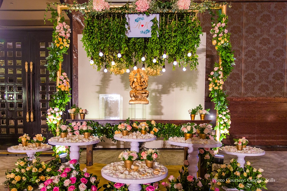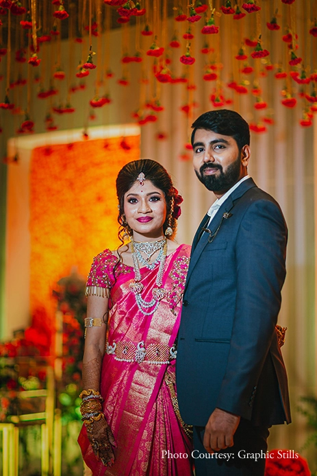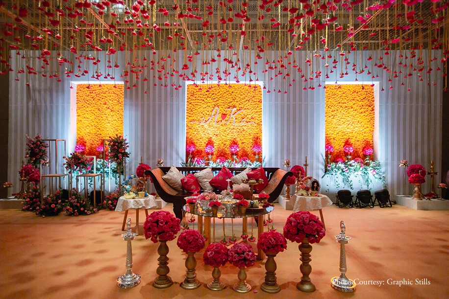 Swathed in hues of red and gold, the wedding was luxurious and traditional. Decorated with brass elements that shimmered under the lights and strewn with rose petals adding a floral fragrance to the air, it was celebrated in traditional Tamilian style. Entering on a delicate latticework chariot, Kirithika was a vision in her bright pink zari saree while Ajaiy kept it simple with a traditional entry seated under an umbrella. Later on, the newlyweds enjoyed sweets together surrounded by their loved ones.