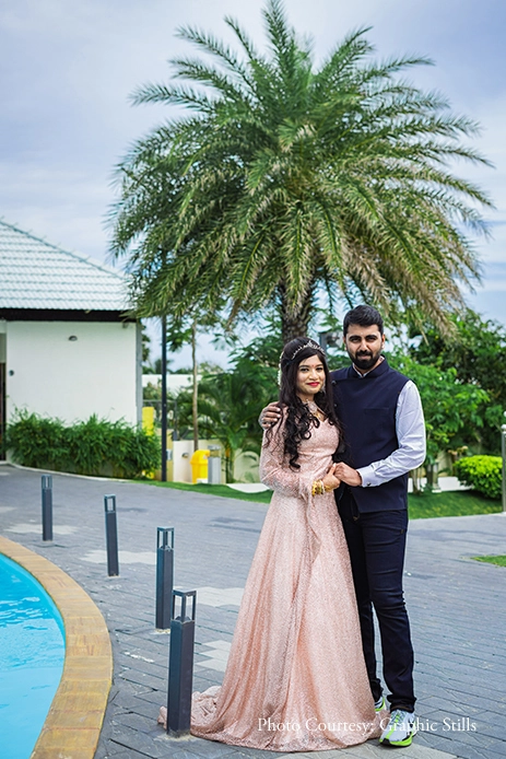The bride shares, “To be honest, the idea for a bridal shower and pre-wedding shoot was born out of the blue. However, all credit goes to my mom who took care of everything, from choosing dresses to booking a makeup artist and finally, choosing a photographer. For the shoot, we kept things simple and fun as we explored the property together. Besides, the overcast sky added a touch of intimacy to all our pictures. For variety, we changed into different outfits which ranged from a vibrant pink pantsuit to a rich red gown. Ajaiy, however, kept it fuss-free in a bow tie suit and an Indo western vest.