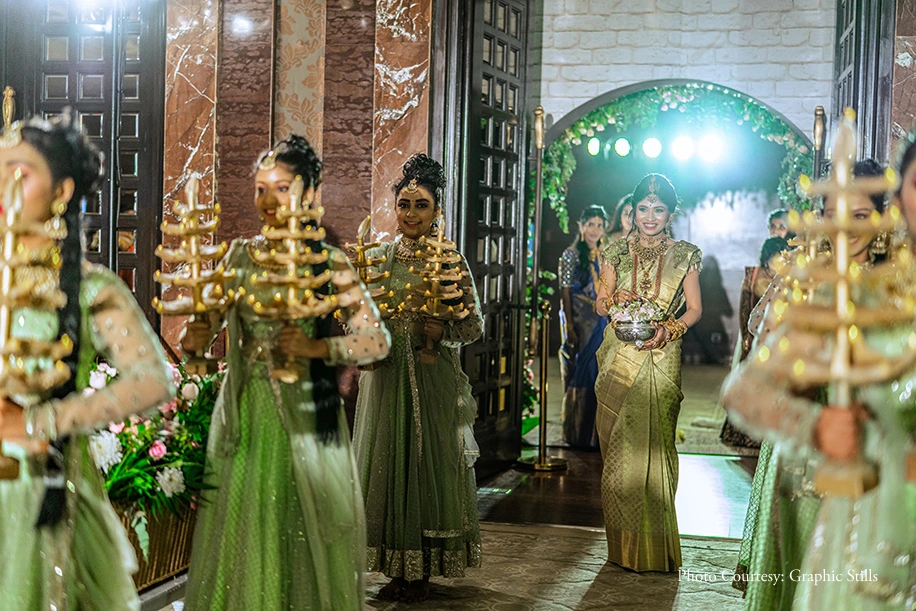 “On this day, both, Ajaiy and I entered the wedding venue together. My mom outdid herself for this welcome as she unfolded so many surprises on us! She arranged dholwalas that greeted us at the gates and executed a grand 21 diya aarti for Ajaiy. Each aarti thali was customized keeping Ajaiy’s tastes in mind. As for the thali or the trays themselves, they were crafted out of german silver and accessorized with silver lamps that were from my mom’s collection”, shares Kirithika.