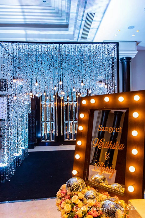 “With a guest list that included more than 1000 people the reception was a huge success. My mom helped me select a Kancheepuram gold silk saree embroidered with original Swarovski crystals for my outfit. Moreover, she also designed the entire set of jewelry which included a tiara for this event from her own cherished collection. The decor of the event consisted of antique gold mirrors that sleekly reflected back every light at the venue. At the entrance, a chariot welcomed the guests along with a photo booth that was adorned with a monogram”, recollects Kirithika.