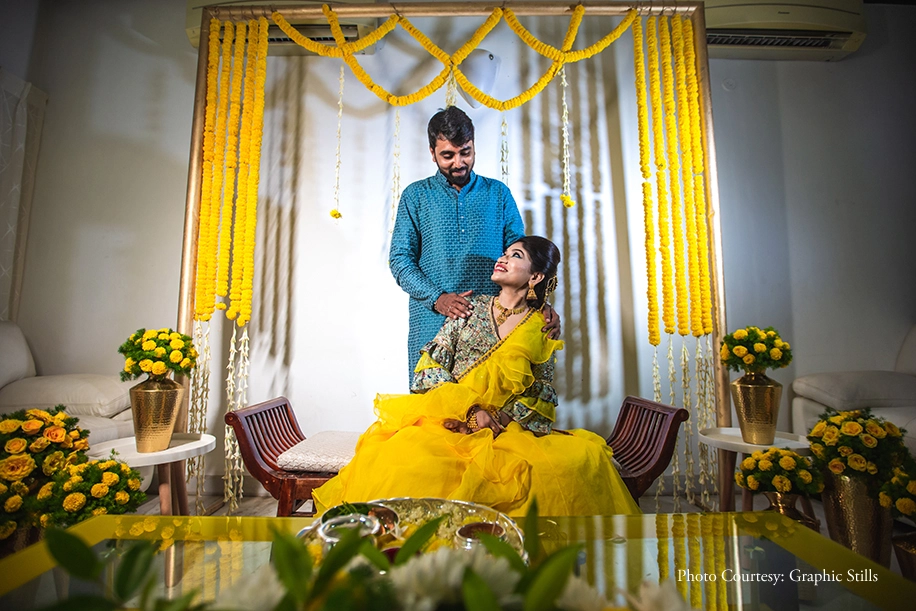 “An event that is close to every bride’s heart, the Haldi marks the start of the wedding celebrations. We kept it simple with yellow marigold peppered all around the house. For my outfit, I chose a breezy mint-green lehenga which I accessorized with a floral tiara. Once the Haldi slathering was done, I changed into a frilly yellow lehenga while Ajaiy wore a teal blue kurta in stark contrast.”
