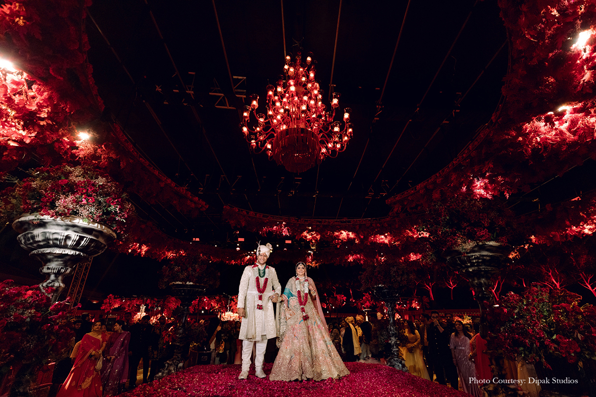 Light pastels, traditional Rajasthani prints and intricate latticework arches made the phera ceremony a serene one. Later, the couple hosted a stunning reception where rich red hues contrasted beautifully with the starlit sky. The duo recollects, “It was a mesmerising evening with its rich red and gold hues. The intricate floral arrangements and chandeliers exuded a regal vibe.”