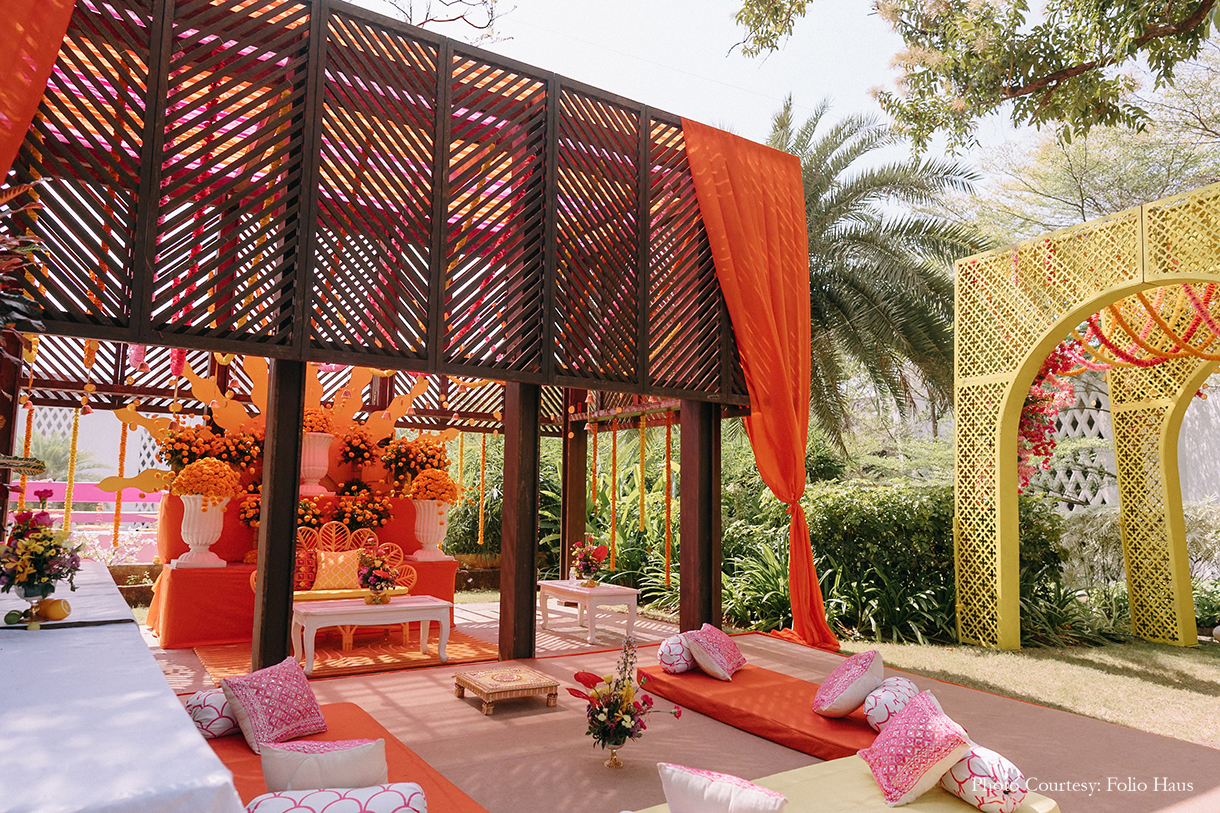 Later in the day, the mehndi witnessed the couple making a stylish entry with color bombs being held aloft to welcome them, a flash mob comprised of their loved ones and of course, in pure desi style, energetic dhowalas playing groovy beats. The poolside mehndi was adorned by pop-inspired contemporary decor, a snooker table where guests gathered to talk and play, a live drummer, a ball pit and vases bursting with bright blooms. The celebrations were followed by lunch and high tea. Plus, the guests were indulged with unique mehndi favors that included scarves and pocket squares.